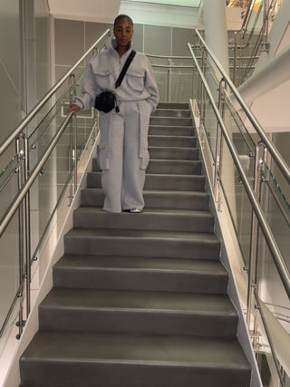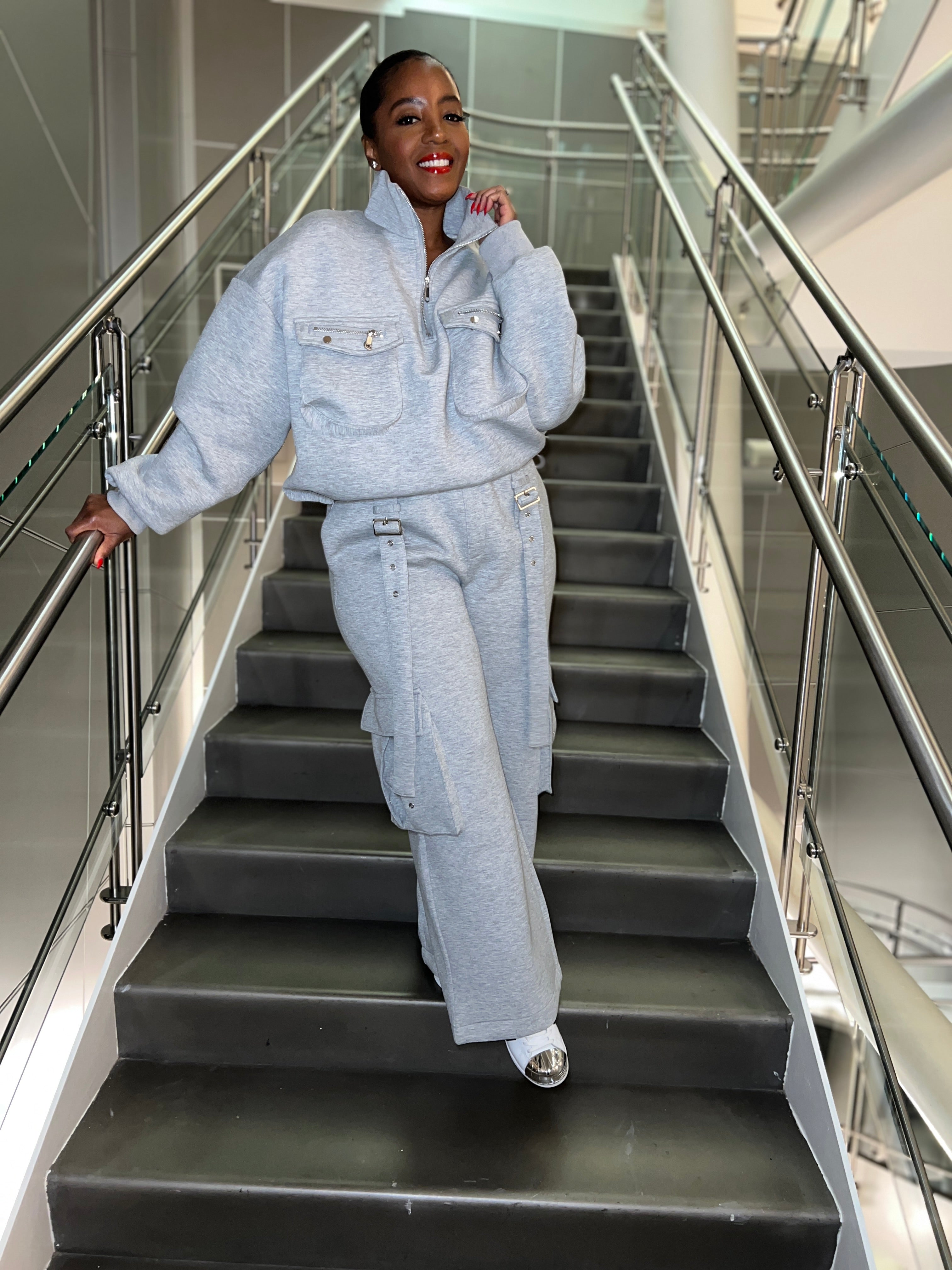 Our luxe jogger set is made out of premium quality material, adorned with zippers pulls and drawstrings. Features 3D pockets with flap and silver grumets. The heather gray is casual, but very chic