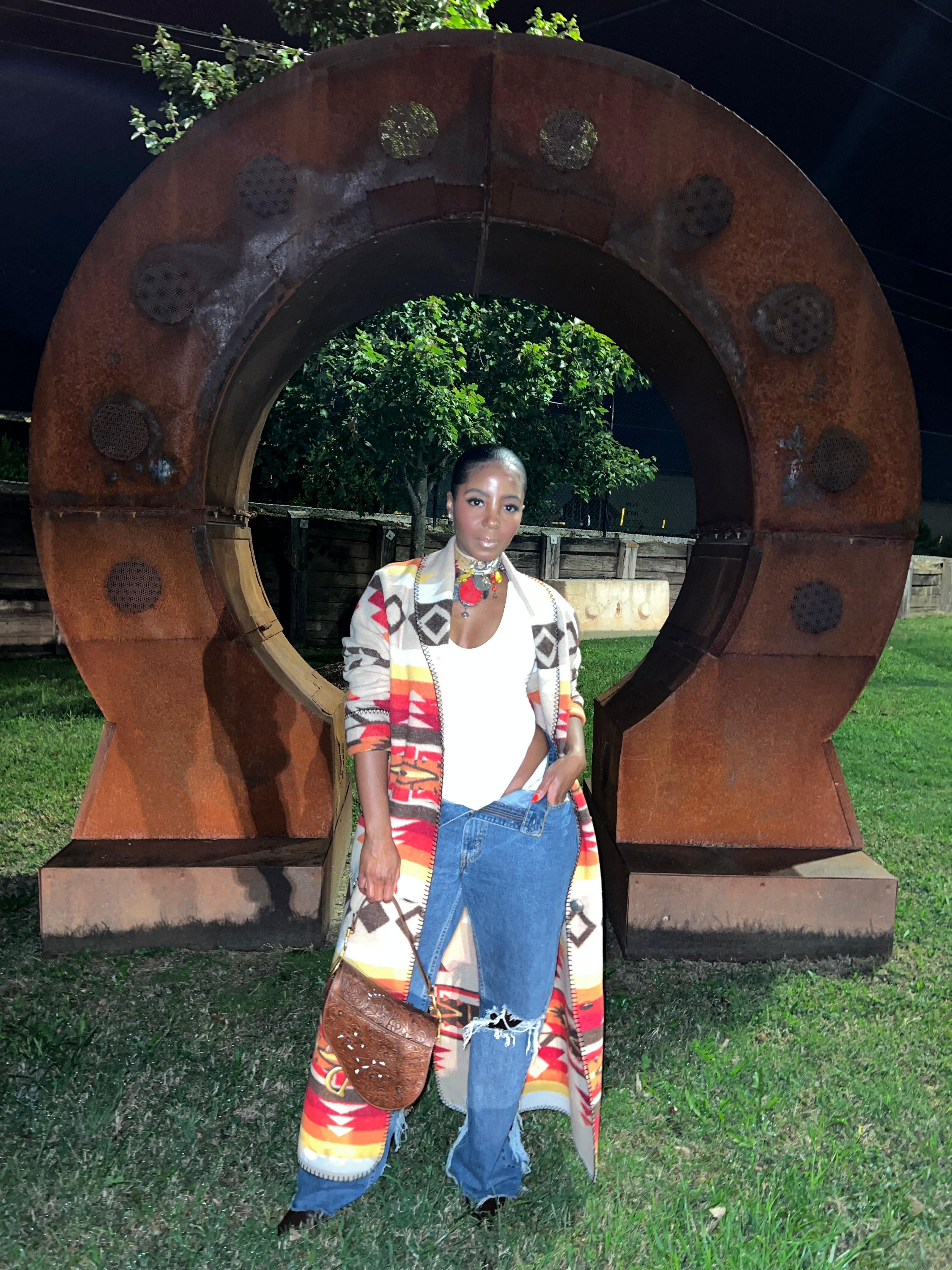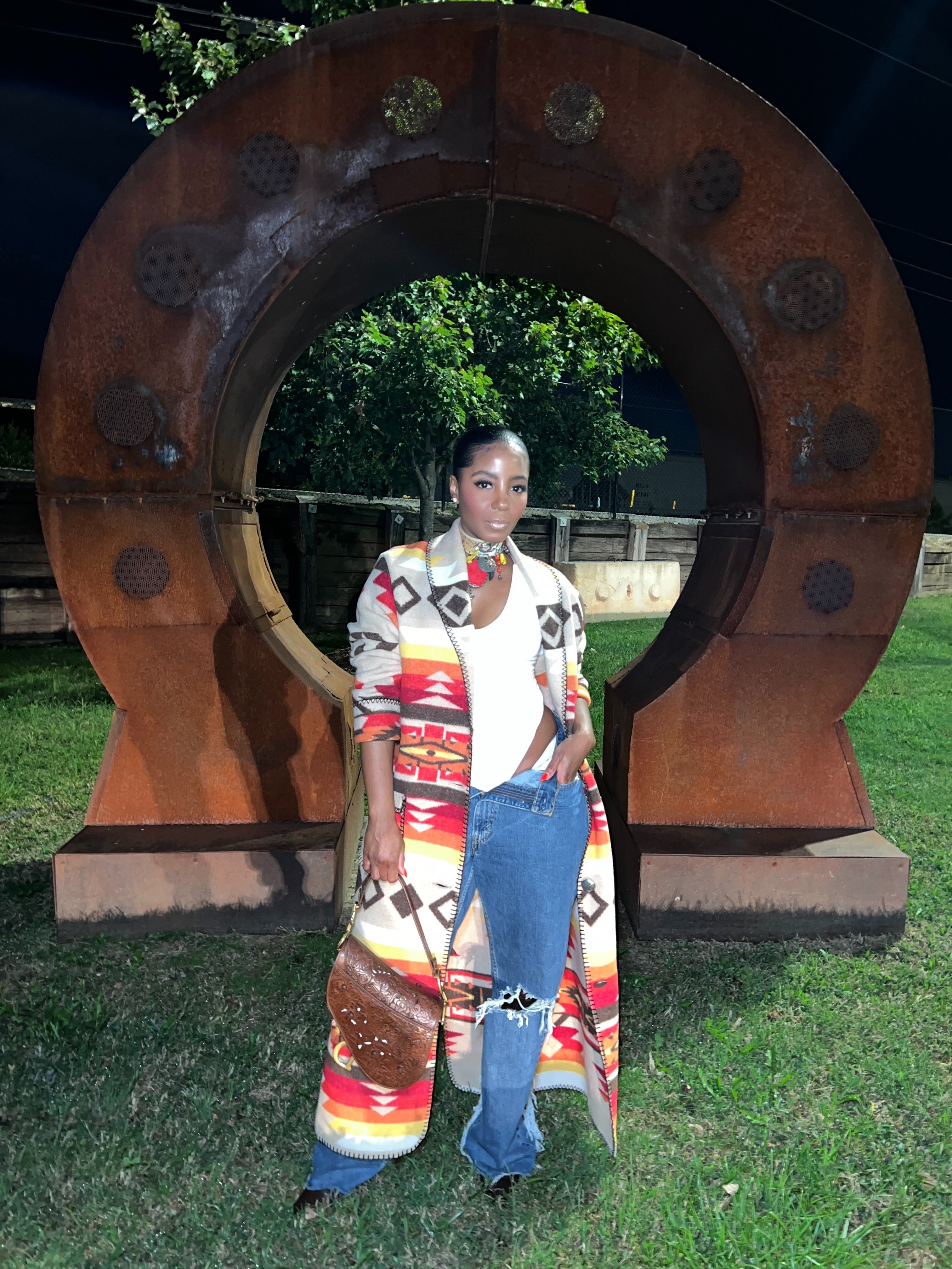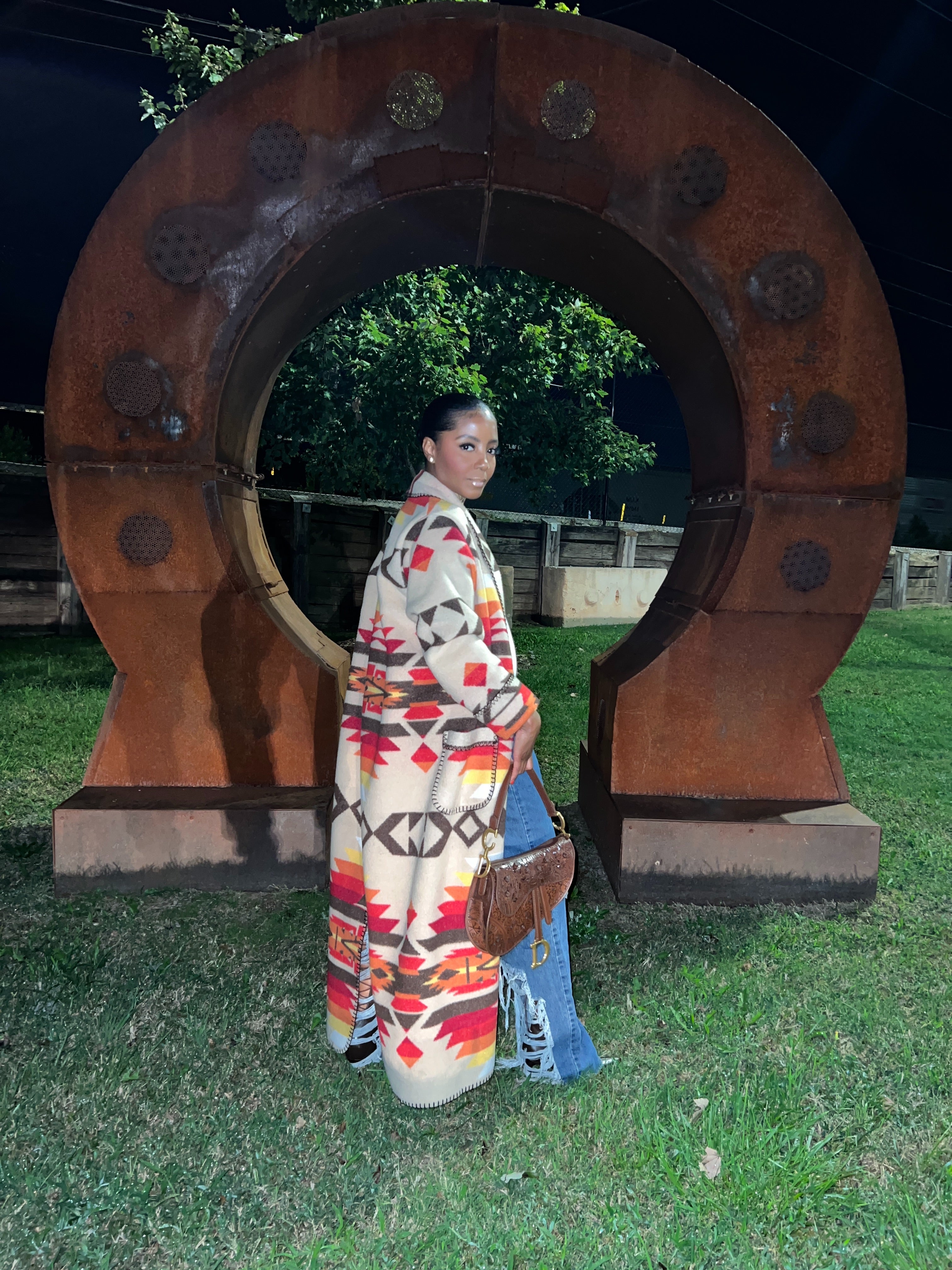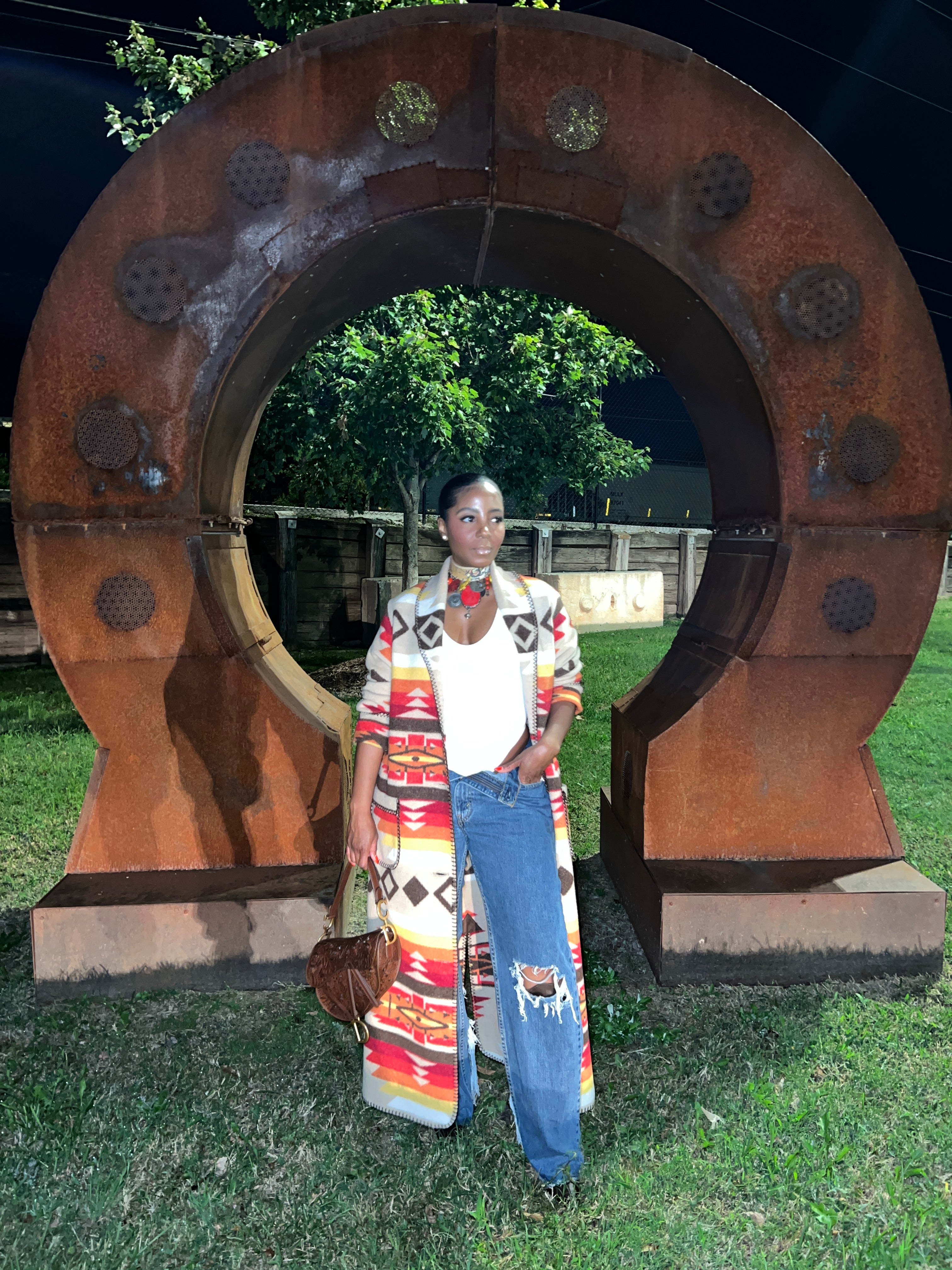 This striking duster is a celebration of earthy and rich tones. Its vibrant, sunset-hued pattern—a mix of deep reds, oranges, yellows, and bold geometric shapes—gives off an energetic, almost nomadic vibe, reminiscent of desert landscapes.