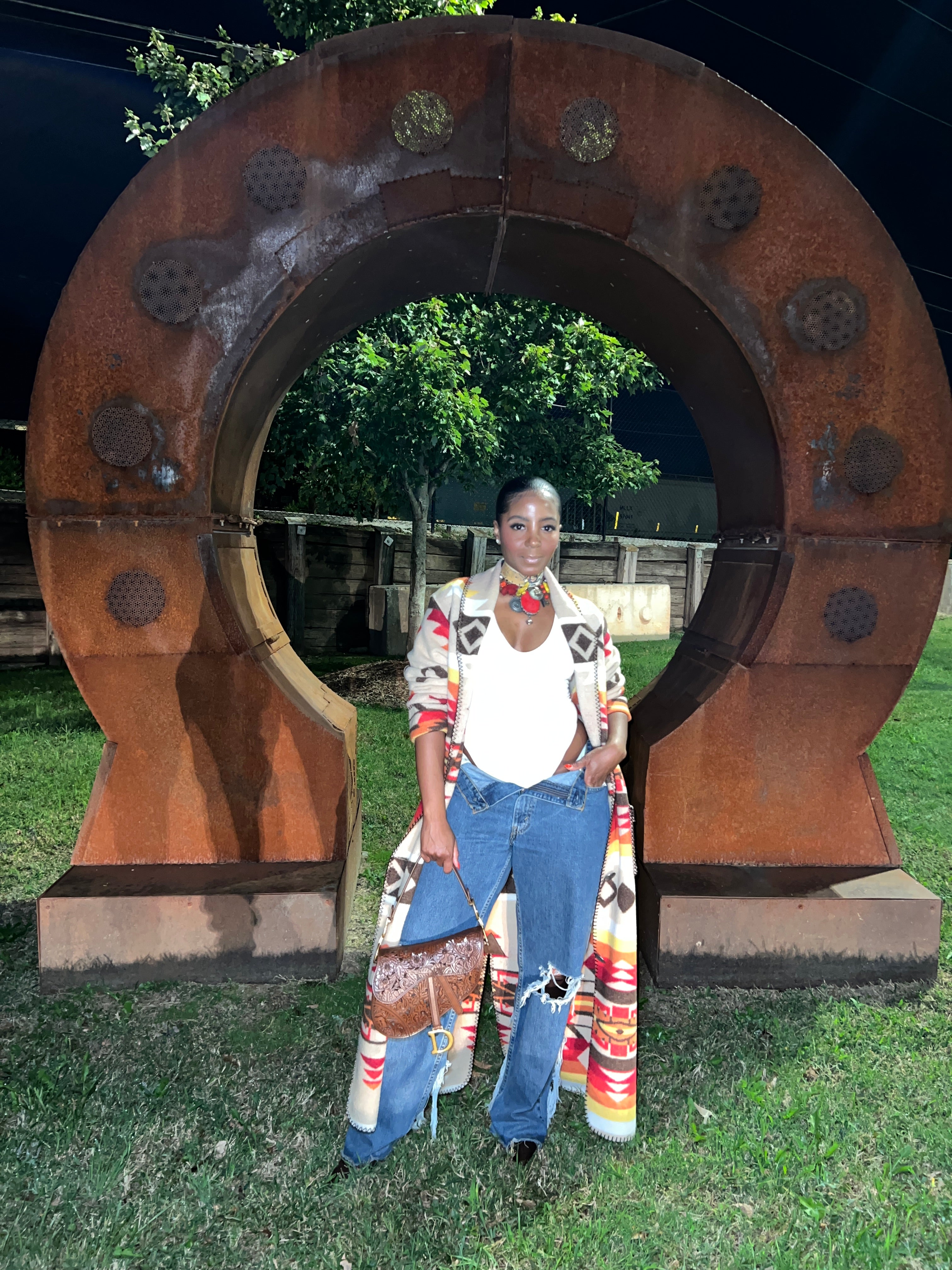 Styled with a statement belt and distressed jeans, this piece embodies an effortless, bohemian elegance with a modern twist.