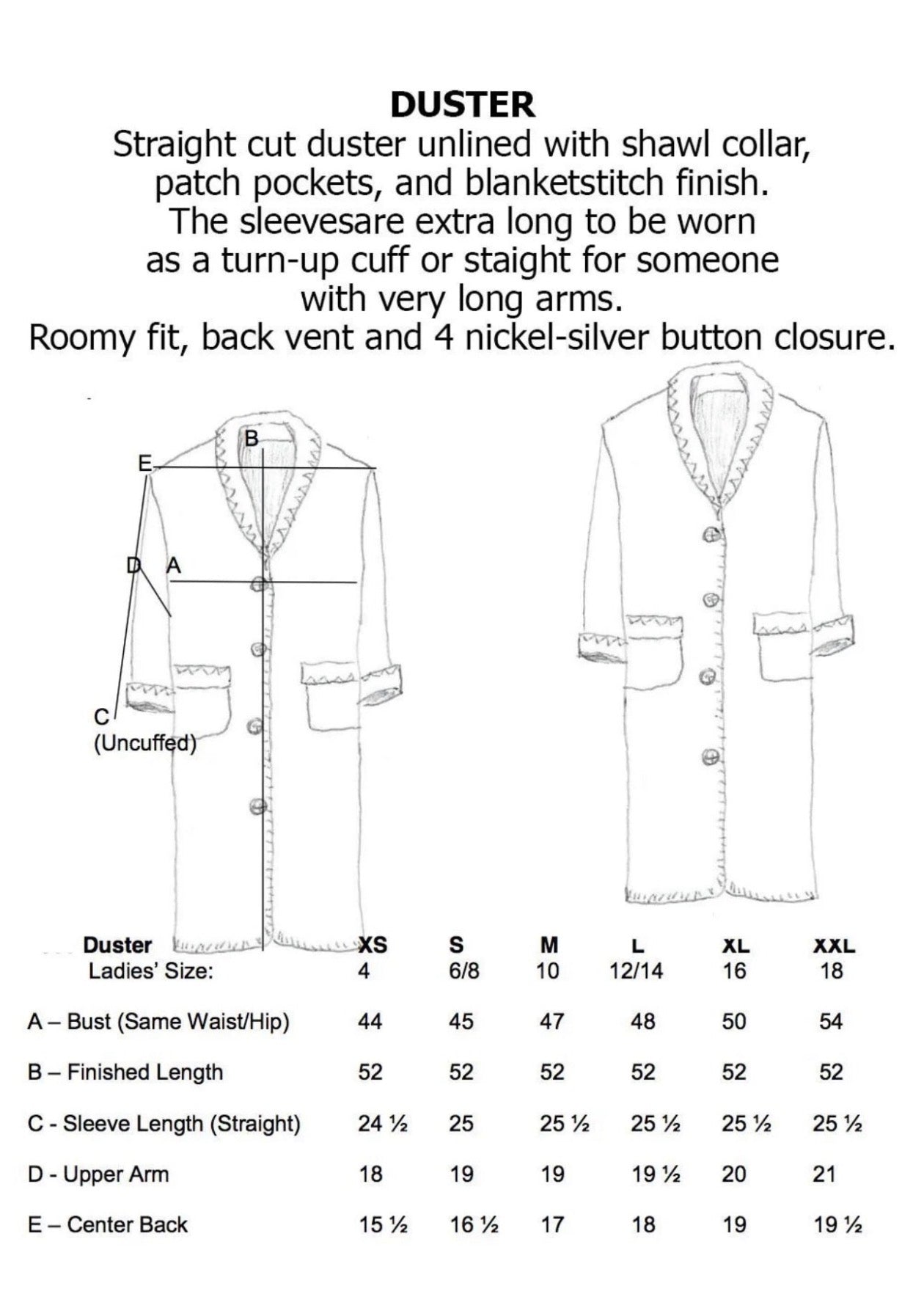 Features a soft wool blend fabric in a generous fit unlined long Duster (52" center back finished length) with a kick vent.
