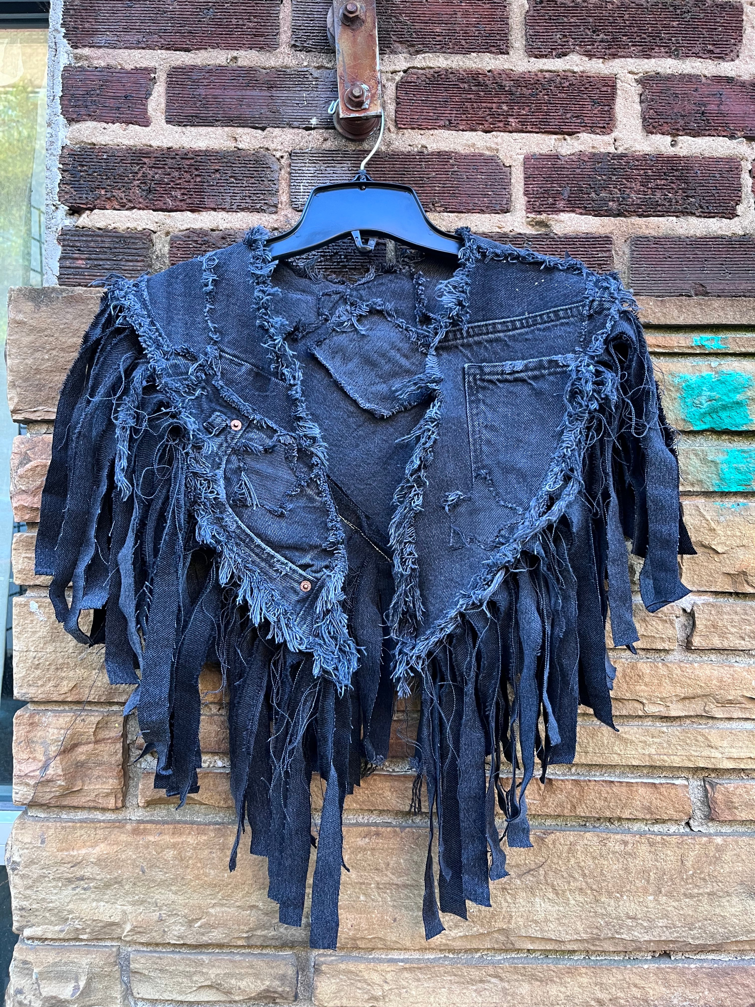 Custom Black Frayed Fringe Pocket Denim Poncho