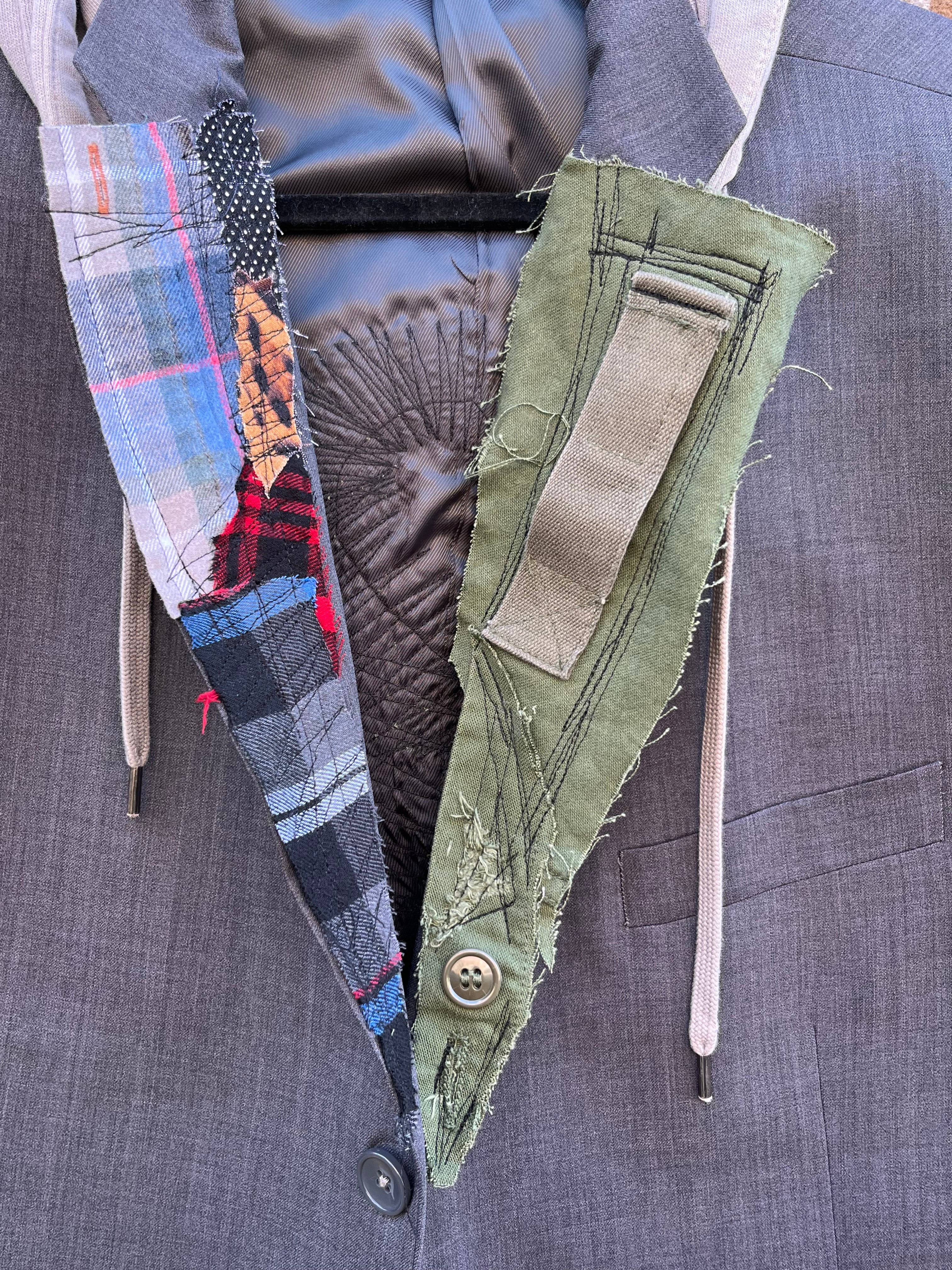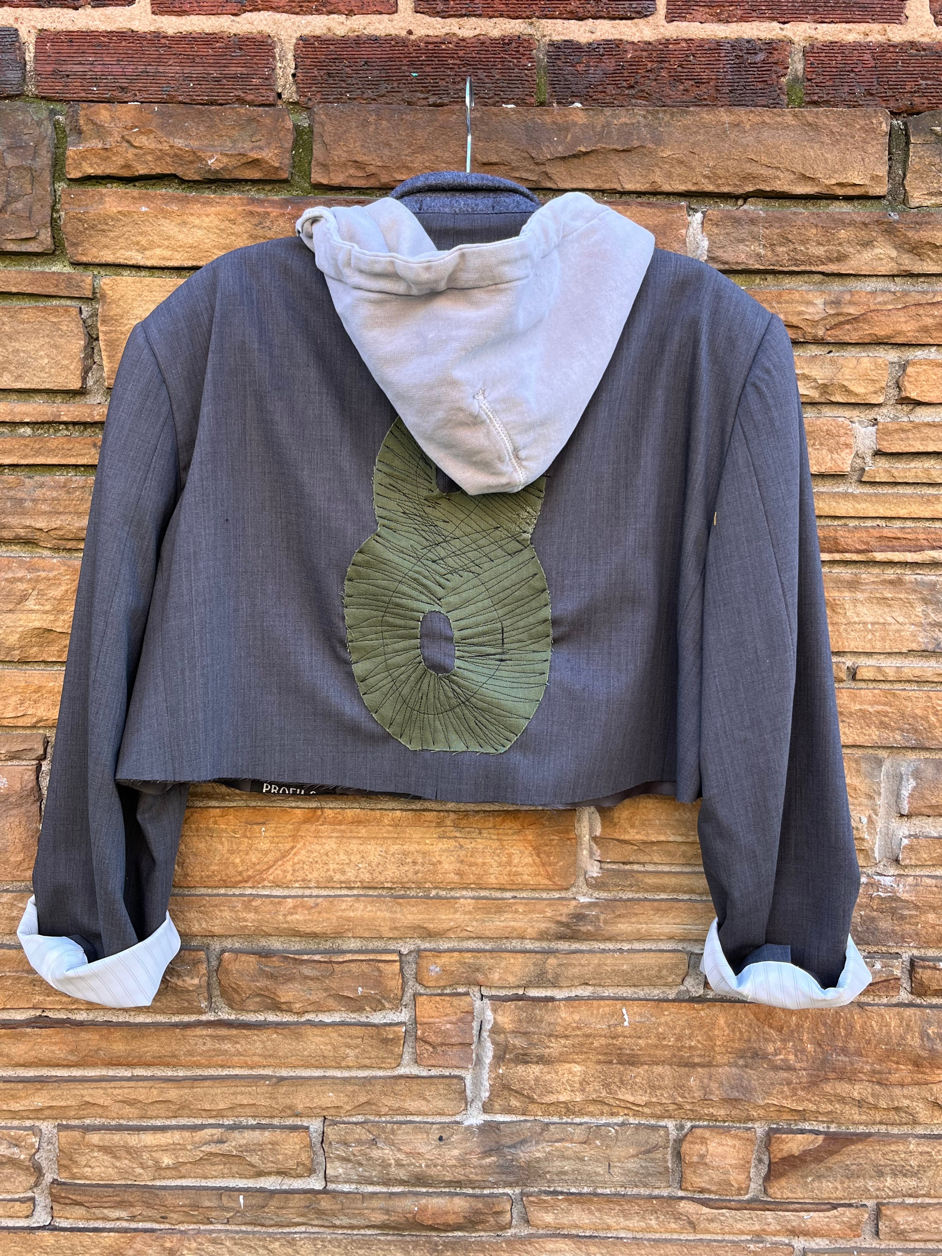 The Custom Crop Hoodie Blazer Army 8 combines a distinctive style with functionality. Featuring adjustable drawstrings for a personalized fit, this one-of-a-kind blazer is enhanced by extraordinary stitching and patches, making it an ideal choice for those seeking a blend of comfort and individuality in their attire.