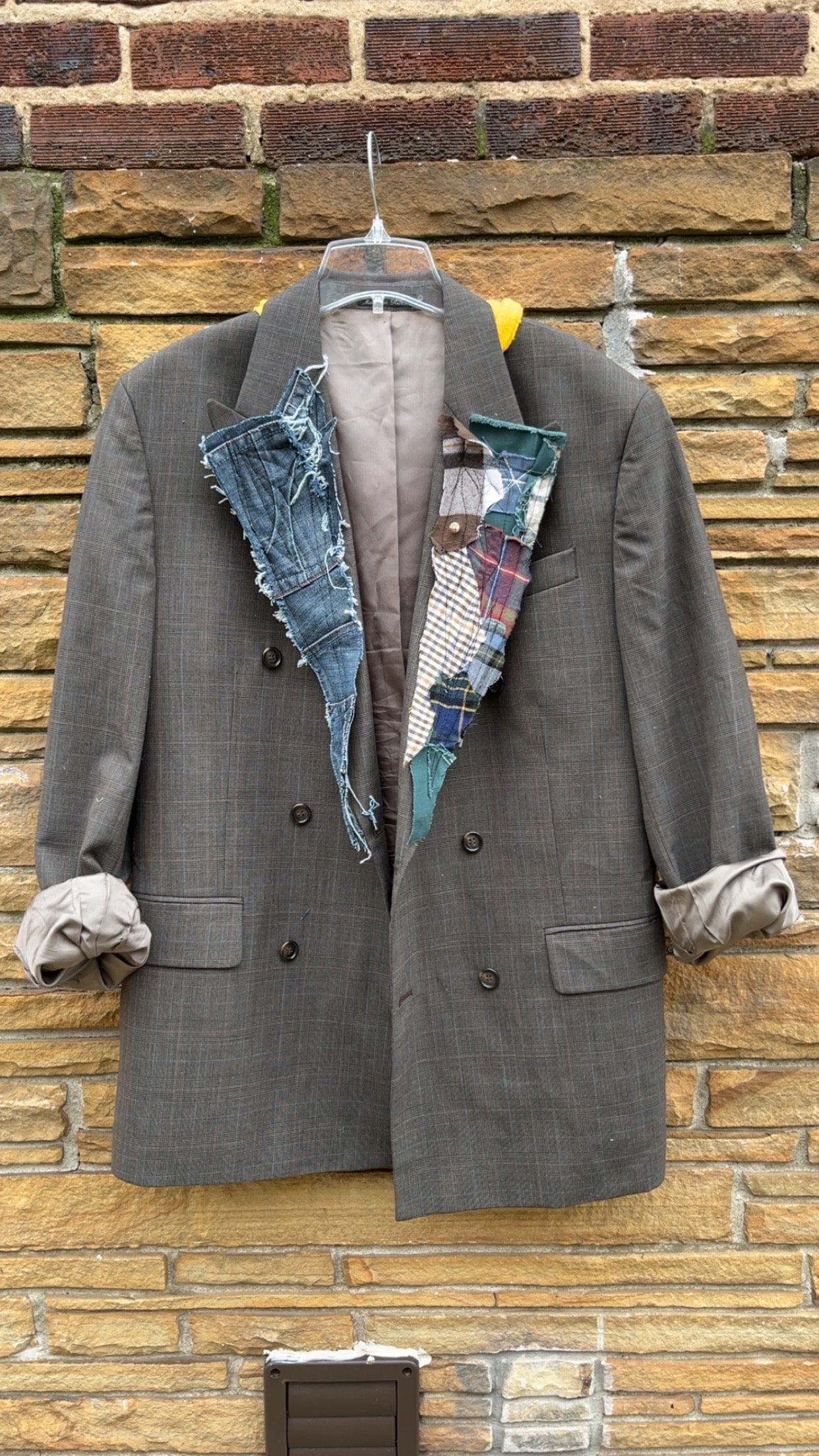Custom Denim + Plaid Patchwork Yellow Hoodie Blazer
