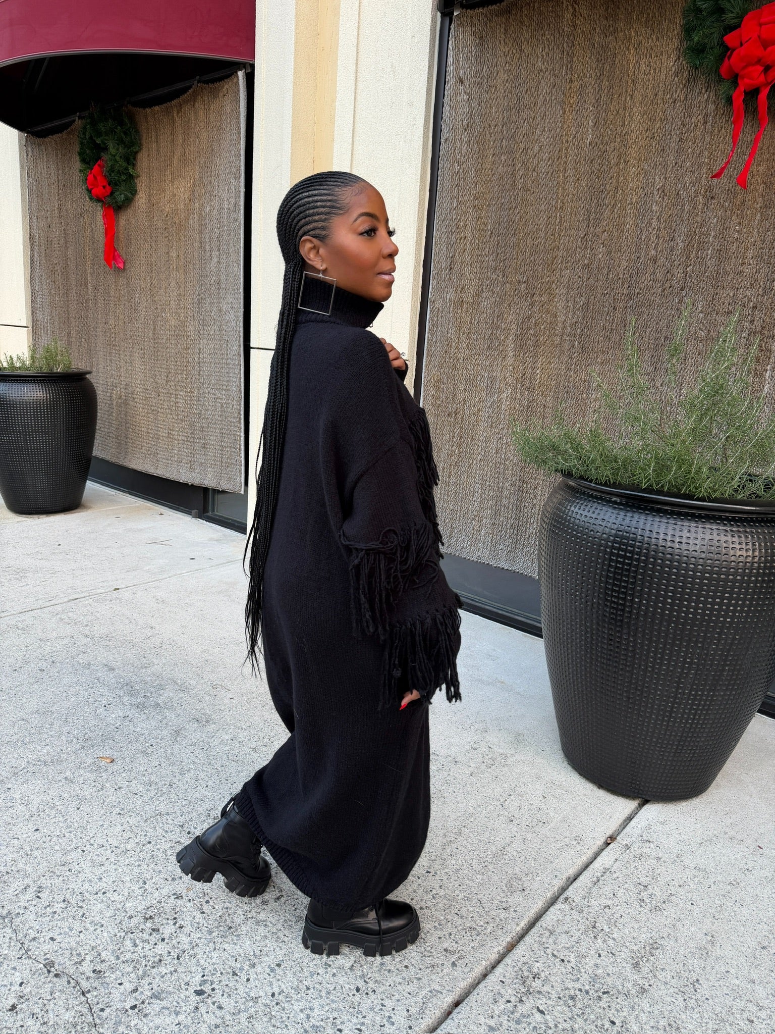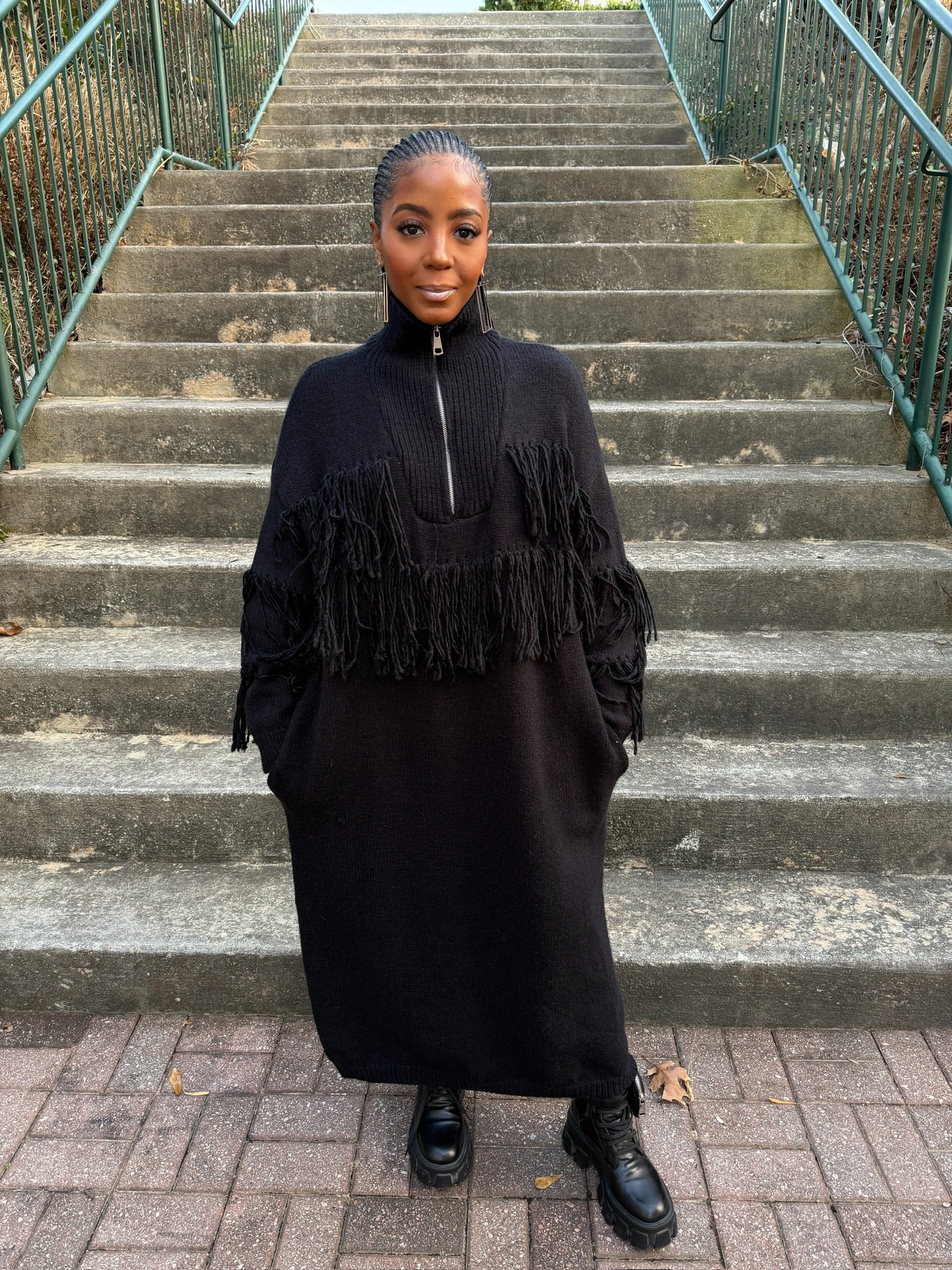 This maxi-length sweater coat is the definition of cozy drama. Designed in a rich black knit, it features a half-zip front with a structured high neckline that adds modern edge and versatility. Statement fringe detailing cascades across the chest and down the arms, creating movement and texture with every step. The relaxed silhouette skims the body beautifully, while the full maxi length delivers effortless sophistication and warmth.