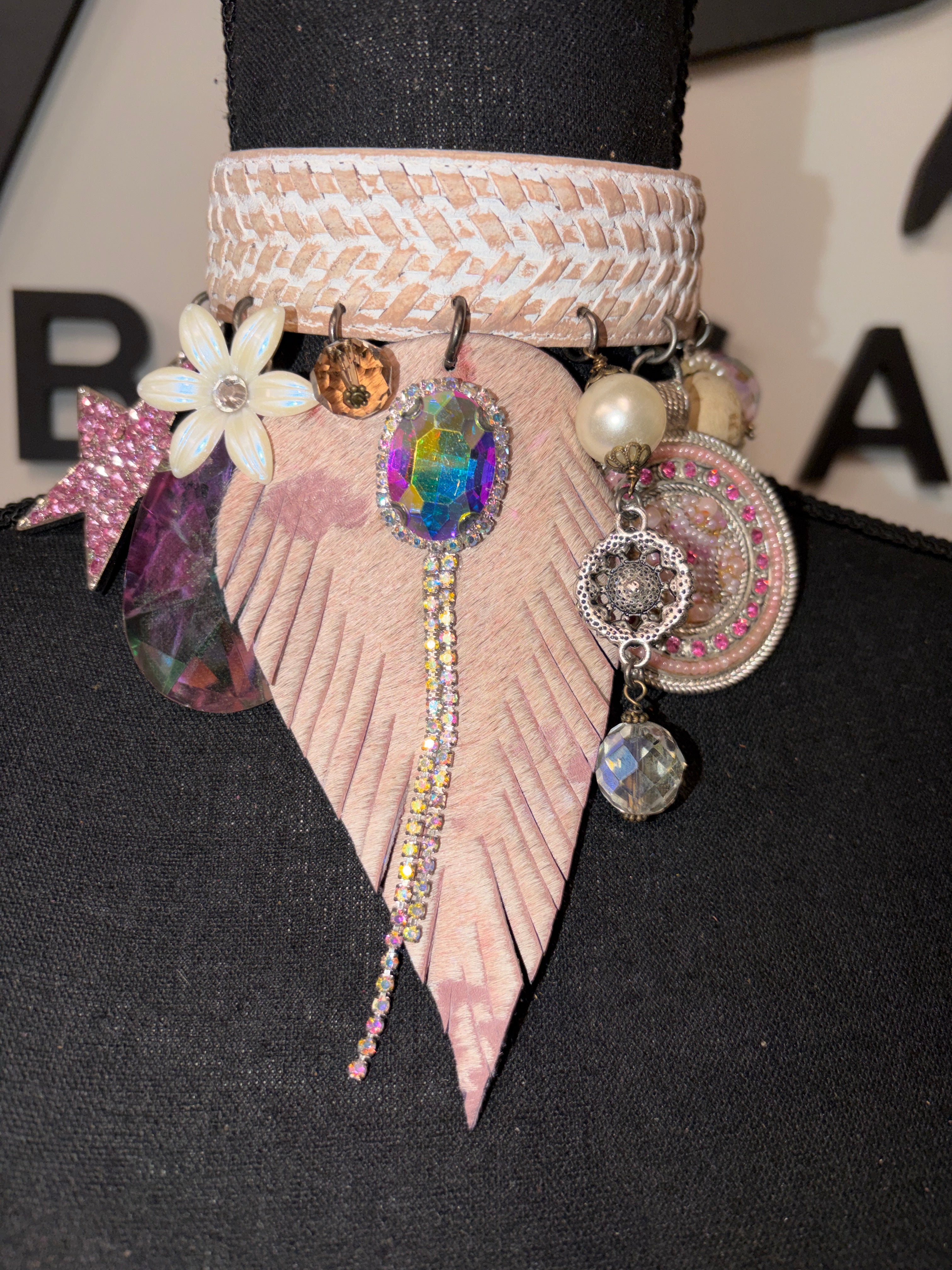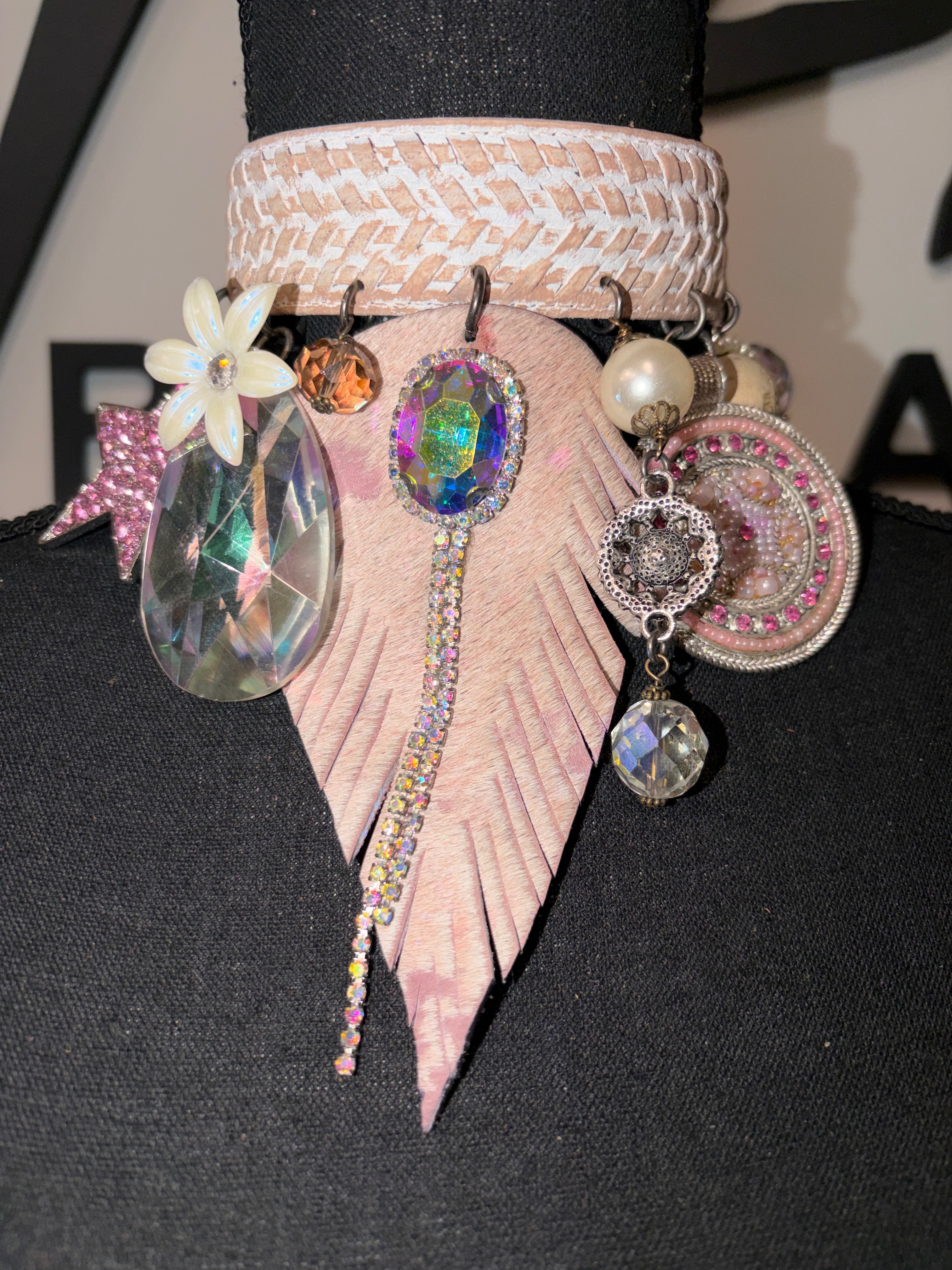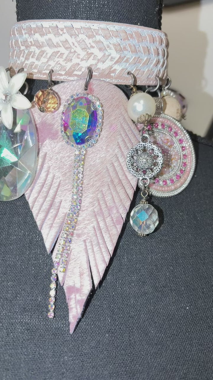 A blush-toned, woven leather band sets a sweet and sophisticated foundation. From it hangs an irresistible cascade of pastel magic: an oversized faceted teardrop crystal, iridescent gemstone ovals framed in rhinestones, a carved floral charm, pearl accents, vintage-style beaded medallions, and a pink glitter star that adds a playful pop. The showstopper? A long, fringe-cut leather feather dripping with sparkling rhinestone strands — giving the entire piece movement, shimmer, and a touch of fantasy.