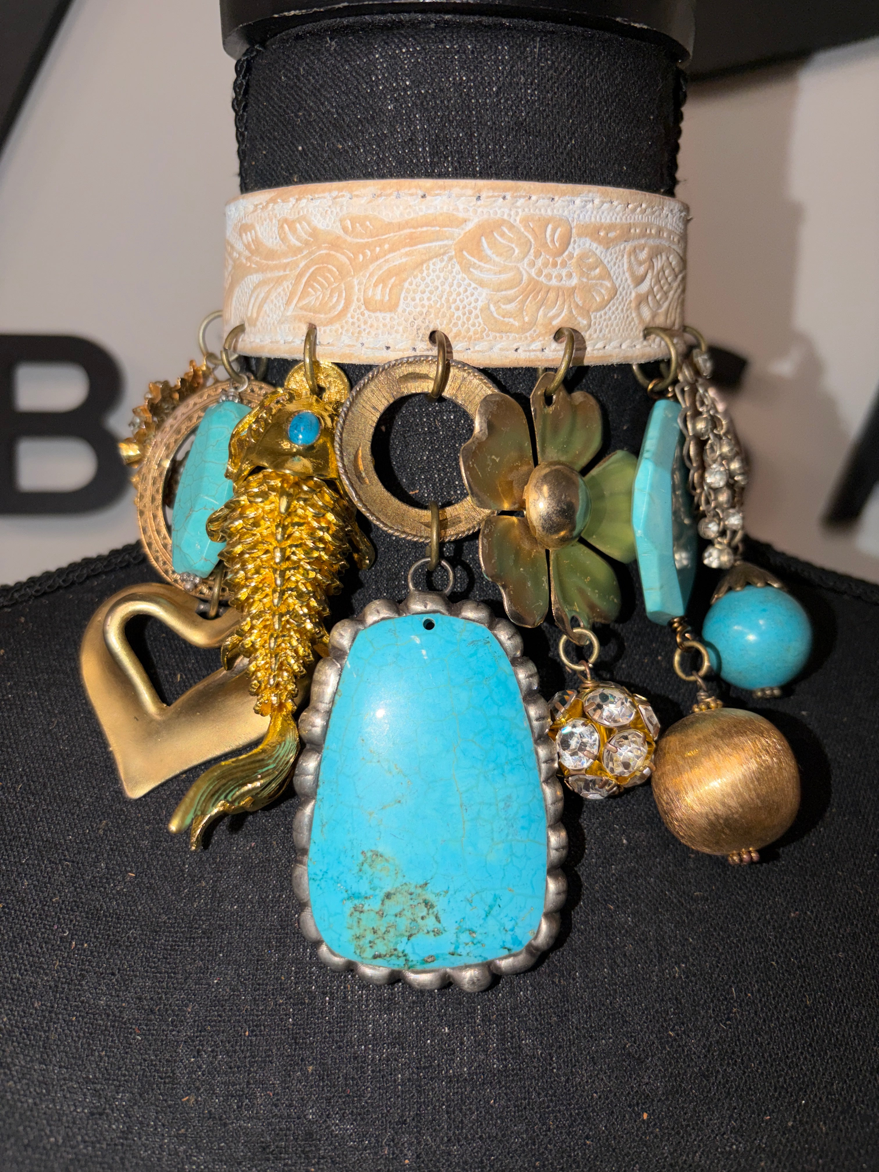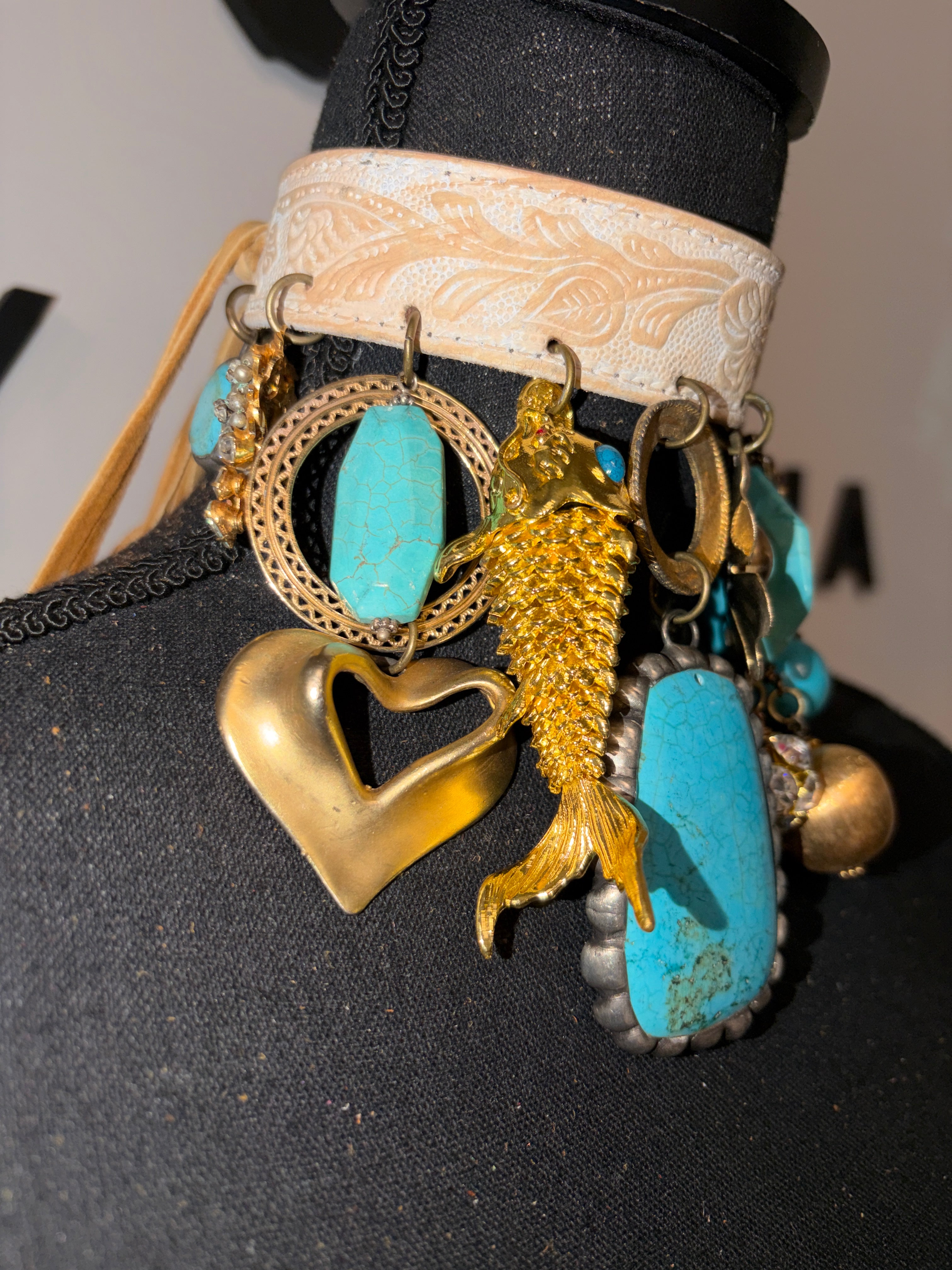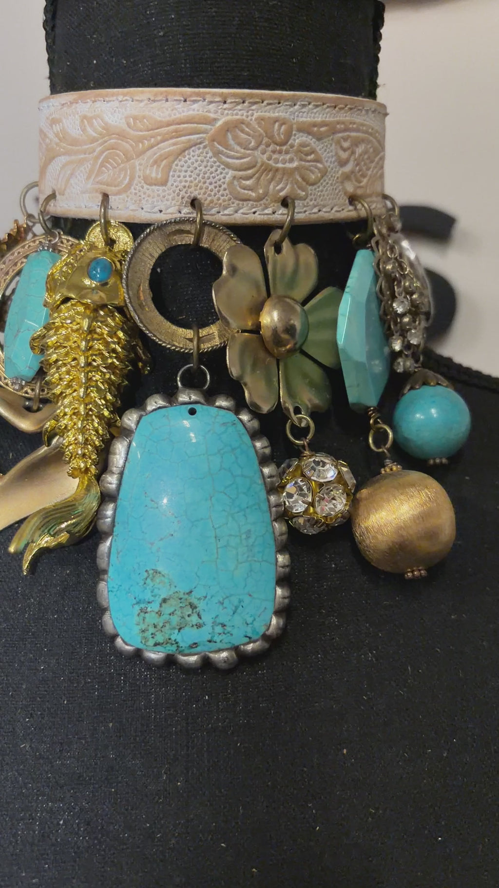 A soft cream tooled-leather band sets the foundation — its embossed floral pattern giving the entire piece a warm, vintage-couture feel. Draped from it is a curated collection of charms in shades of turquoise, gold, and crystal: a large crackled turquoise pendant framed in rustic metal, a sculptural gold flower, faceted aqua gemstones, shimmering rhinestone clusters, smooth metallic spheres, and a cascading chandelier of antique-style crystals.