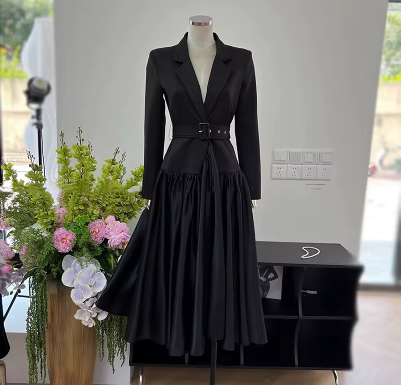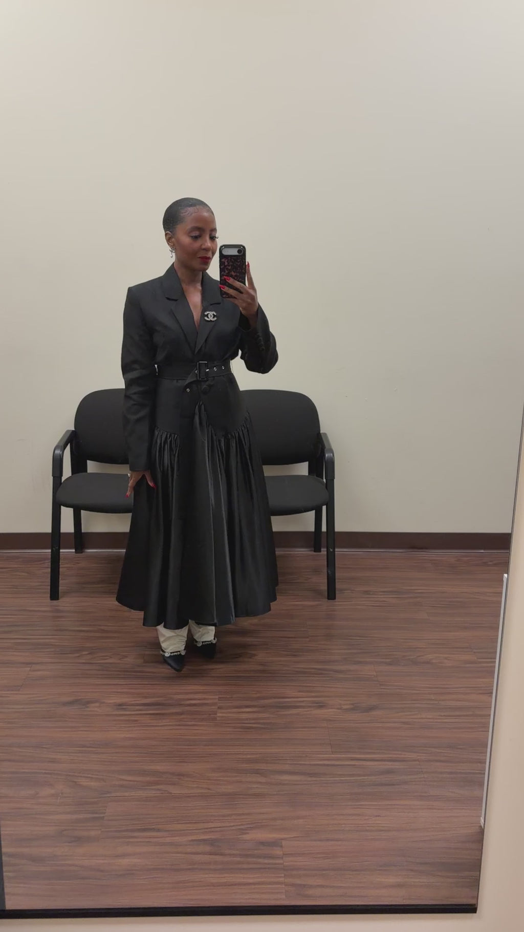 Tailored with a sharp, structured lapel collar and long sleeves, this piece blends the polish of a blazer with the drama of a full, flowing skirt. A sleek, double-grommet belt cinches the waist to perfection, creating a sculpted silhouette that flatters every curve.