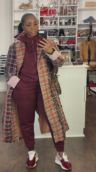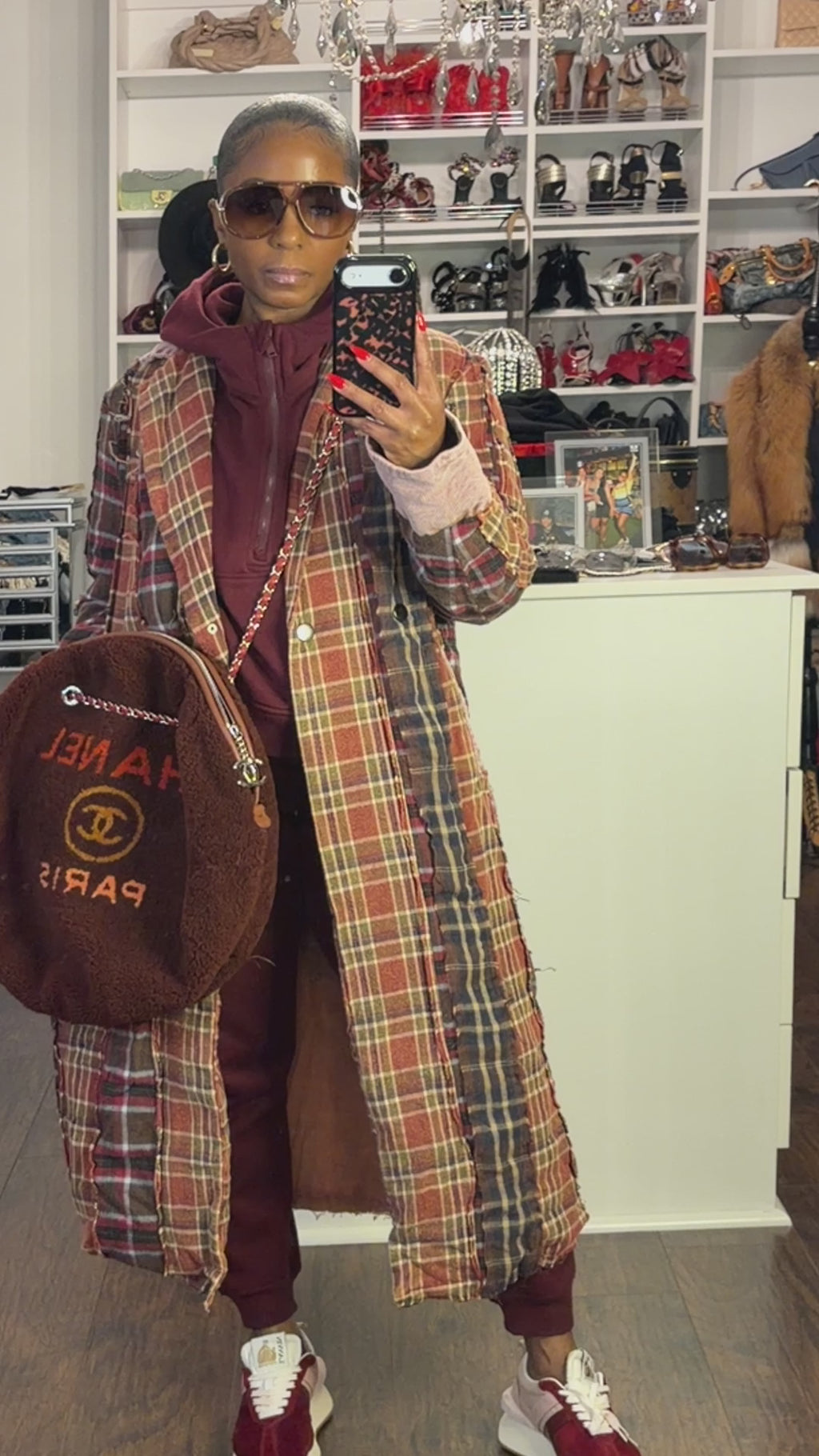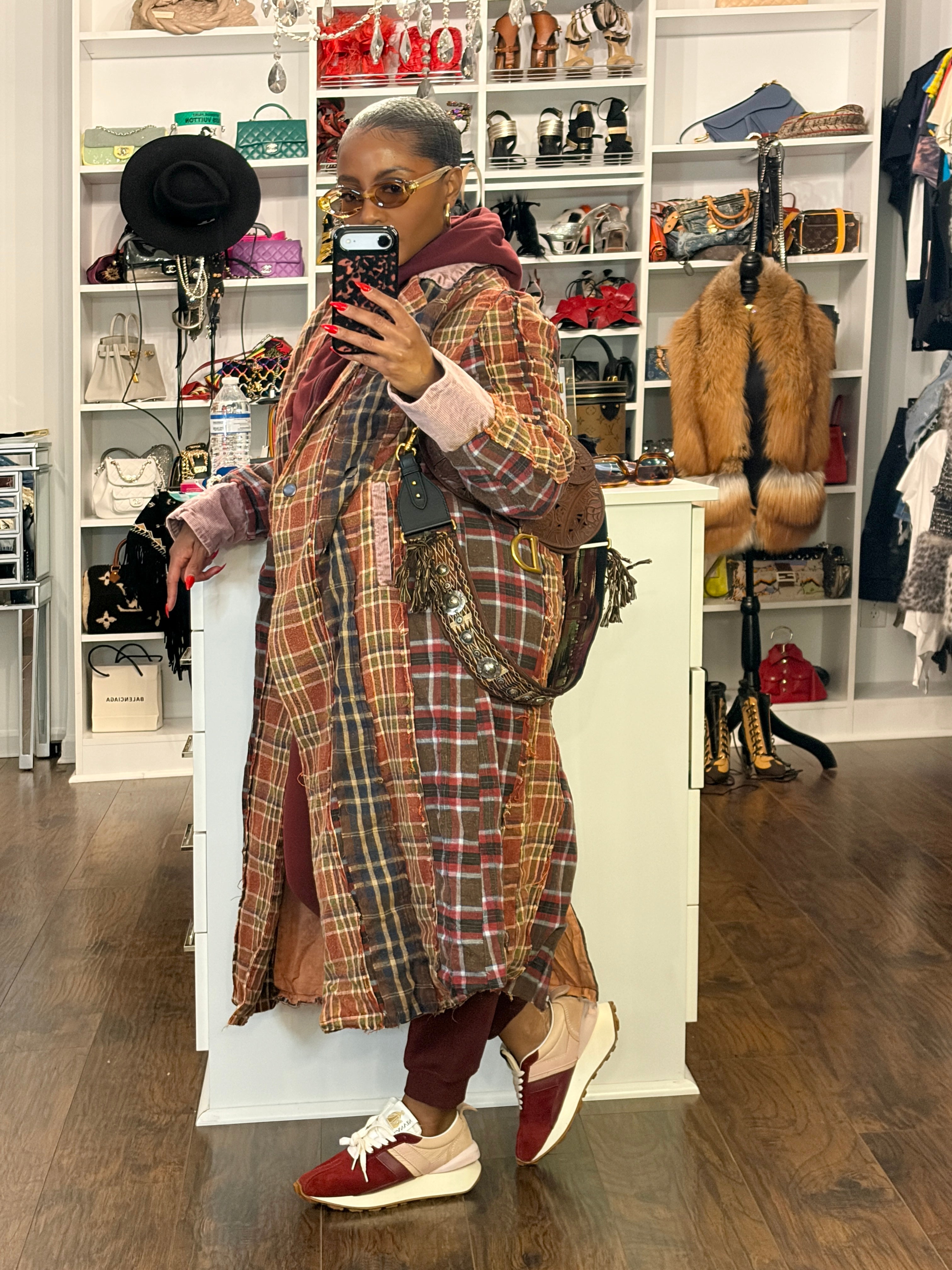 This plaid statement duster is a masterclass in premium construction and elevated layering.