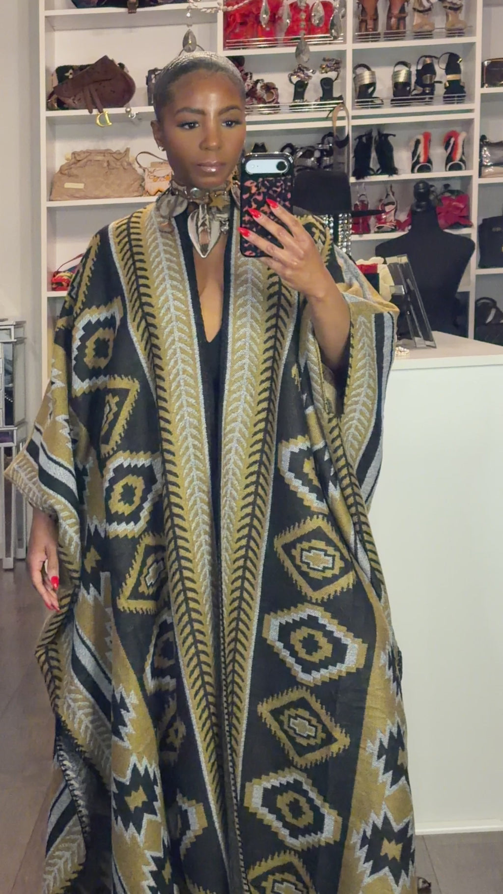 Elevate your wardrobe with our stunning Aztec-patterned kimono. Beautiful warm knit. The gorgeous gold, silver, and black intertwine to add a touch of luxury to any outfit.