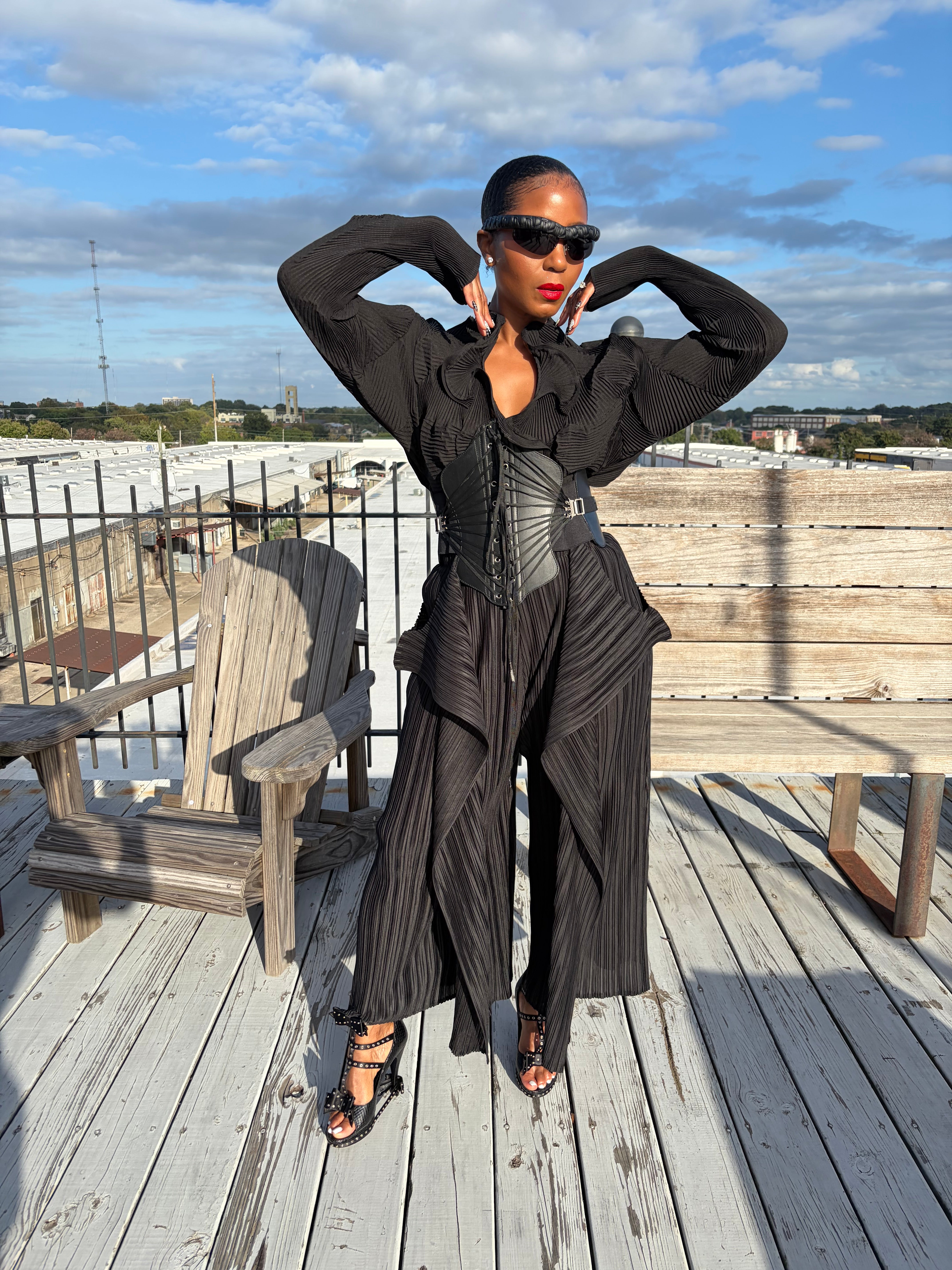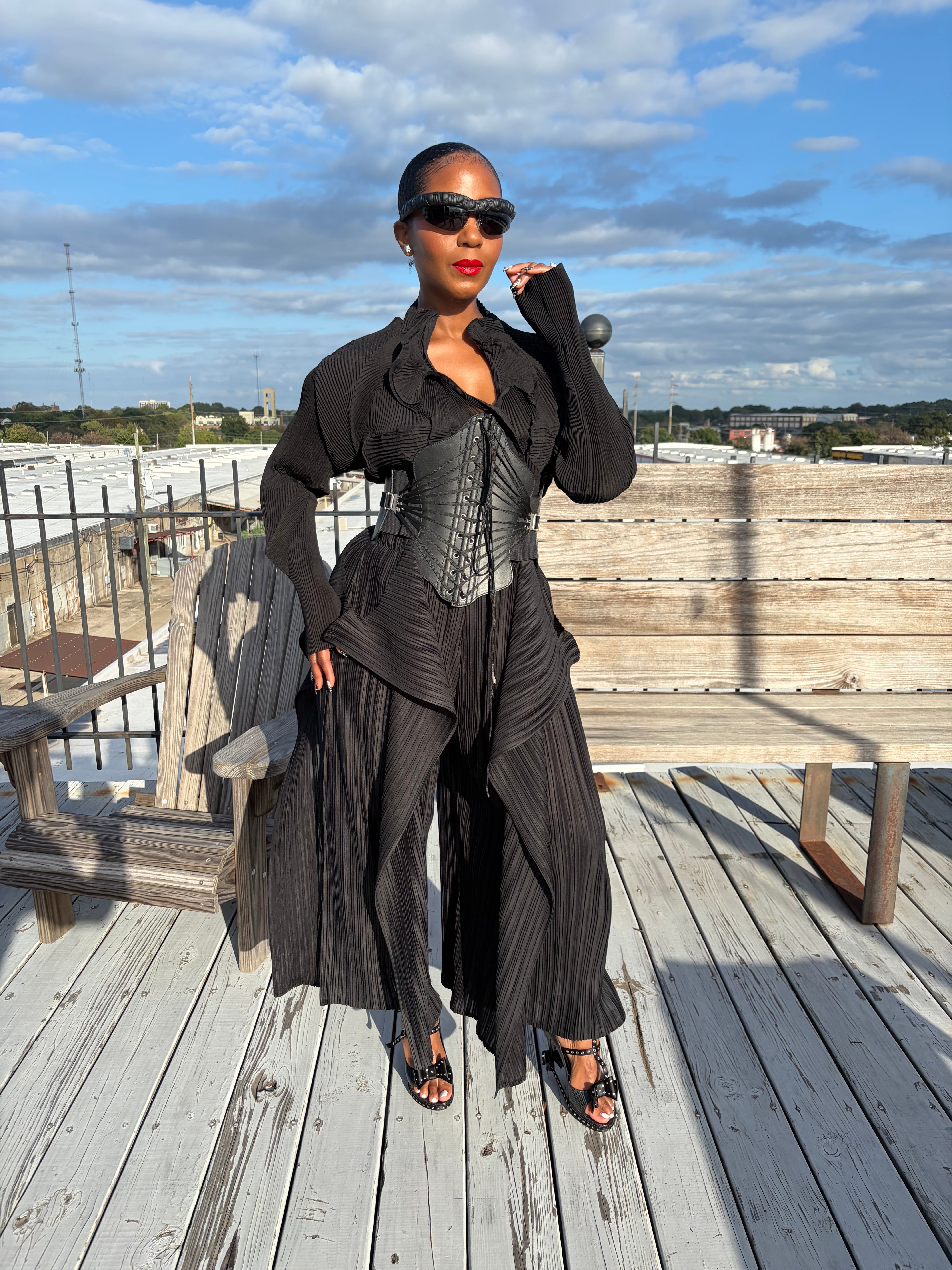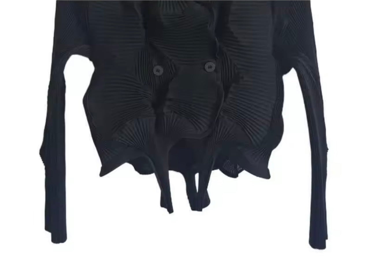 Crafted from finely pleated fabric, it features sculptural, origami-like folds that ripple across the body—creating movement and texture from every angle.