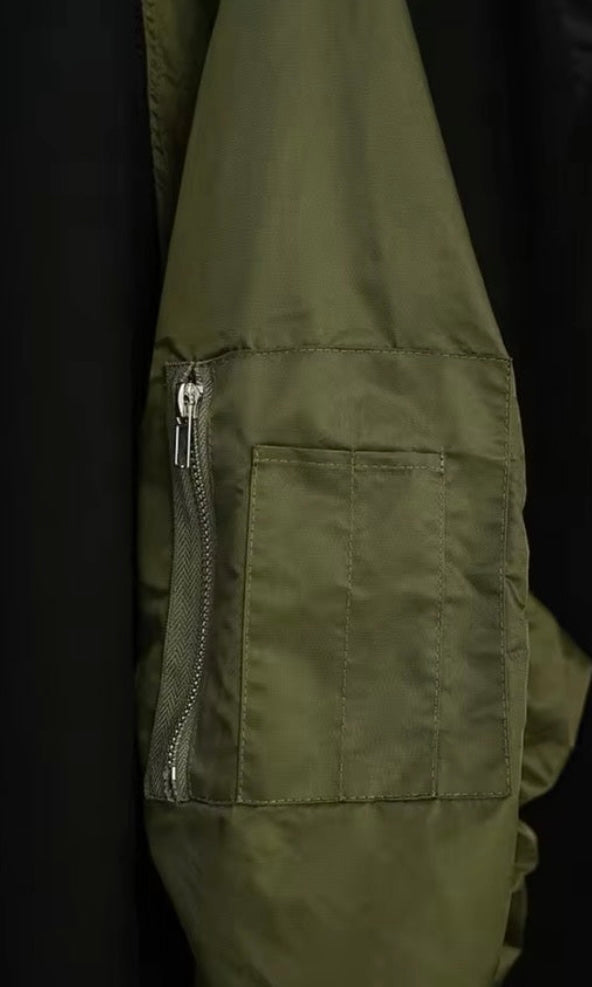 zipper cargo pocket on the arm, gathered ruching detail throughout and adjustable drawstring in the back, creating a peplum design.