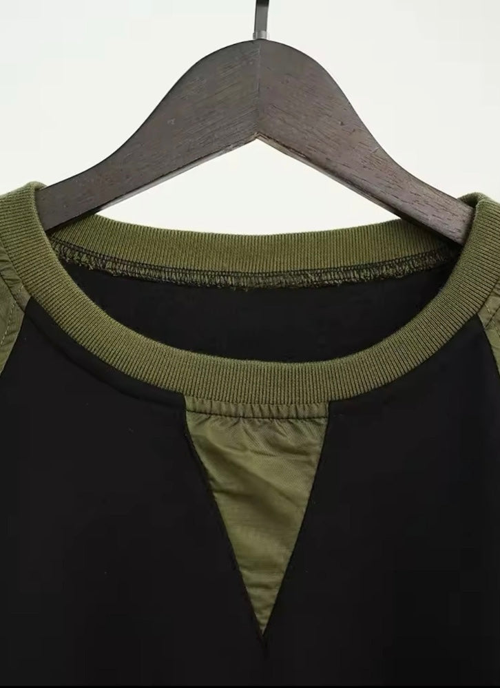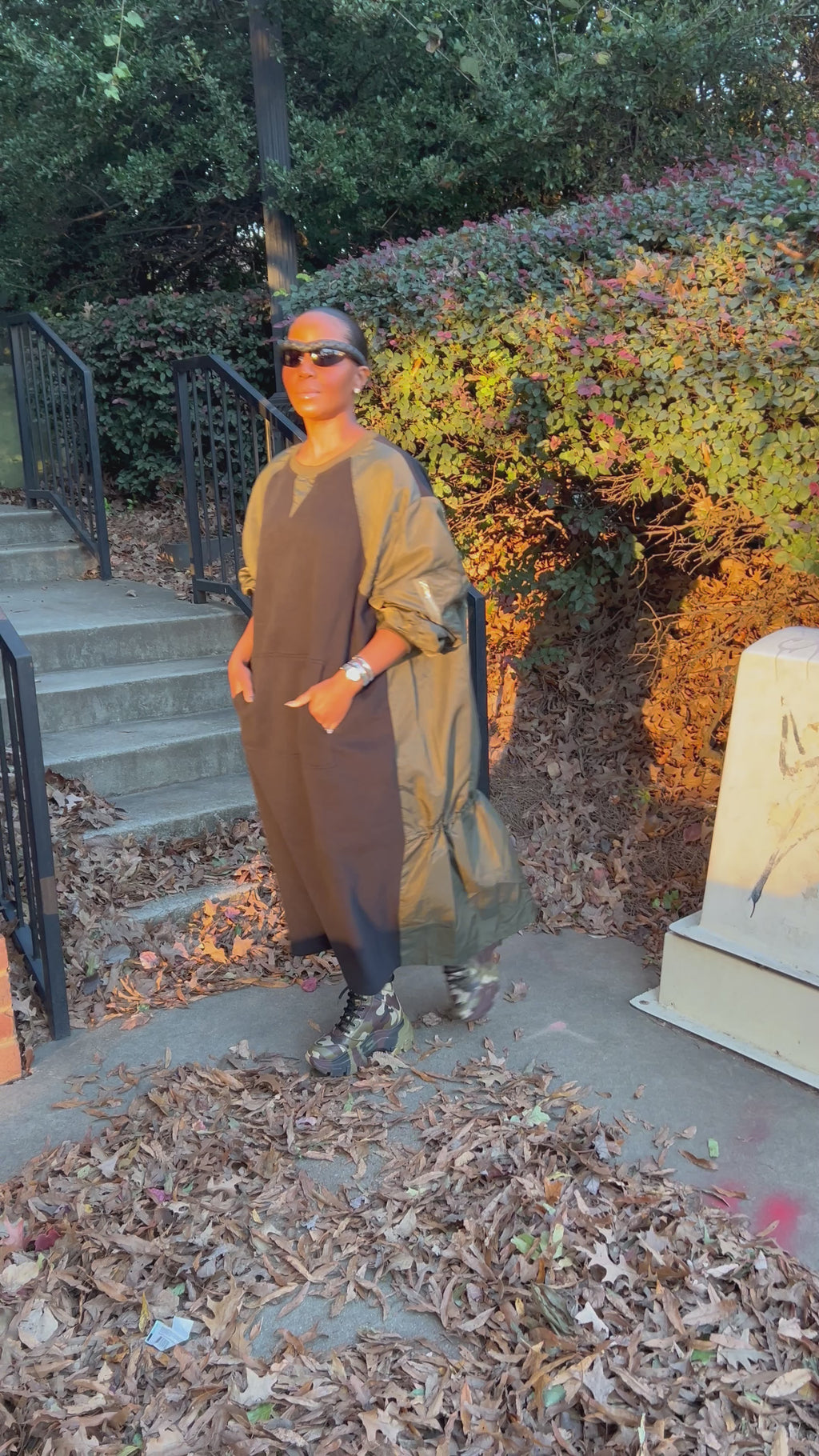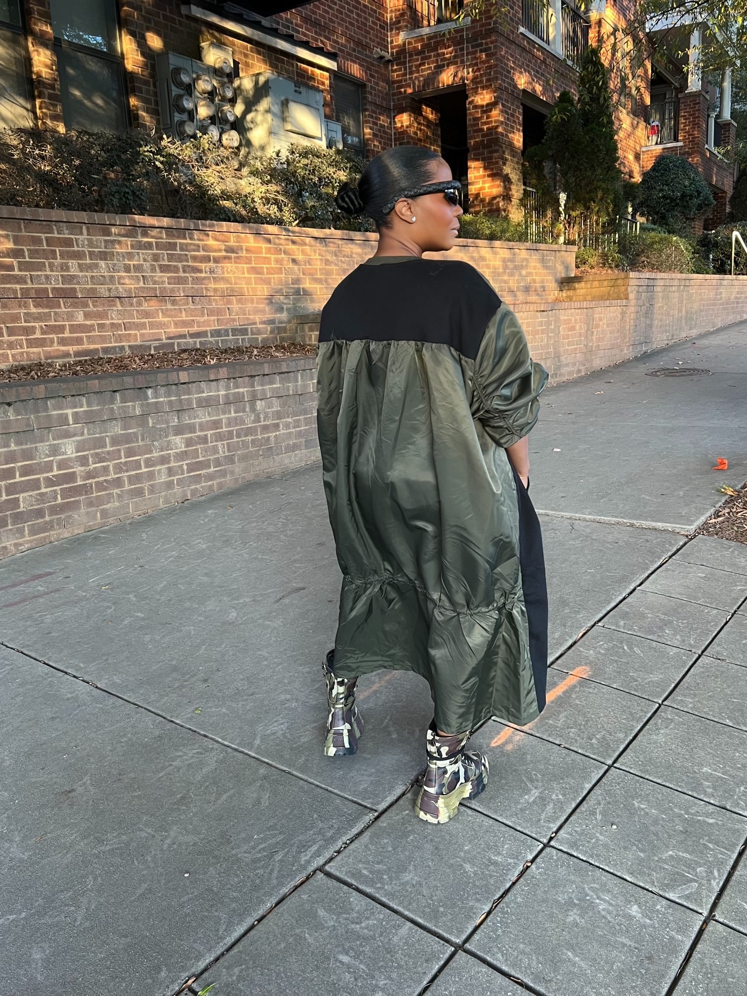 The dress combines a chic oversized silhouette with a blend of olive green nylon and black accents, creating a playful yet structured style.
