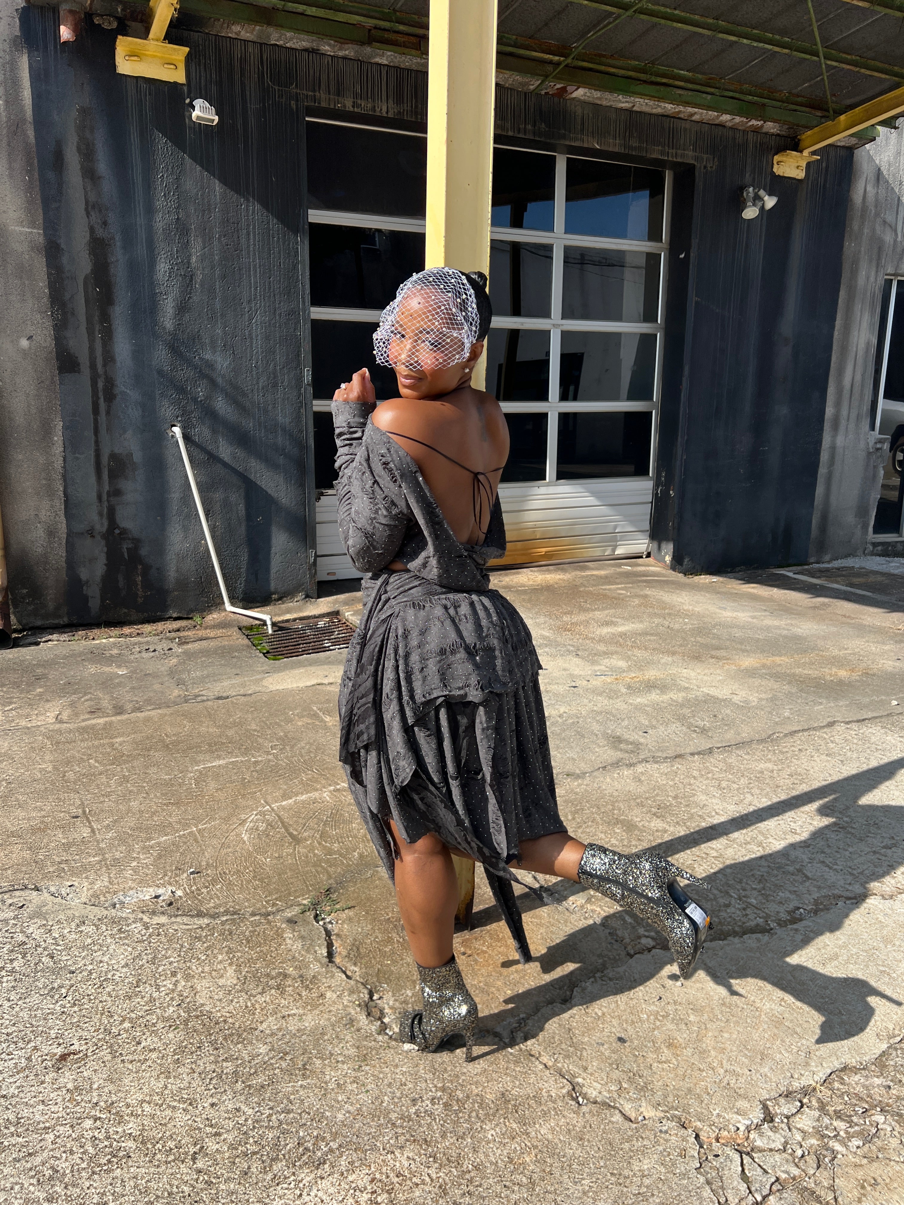 The skirt takes it to another level — a cascade of asymmetric, layered panels with a deconstructed look that feels both artful and rebellious. The multiple layers create movement and drama with every step, while the distressed crystal detailing ties it back to the top for a cohesive, polished look.