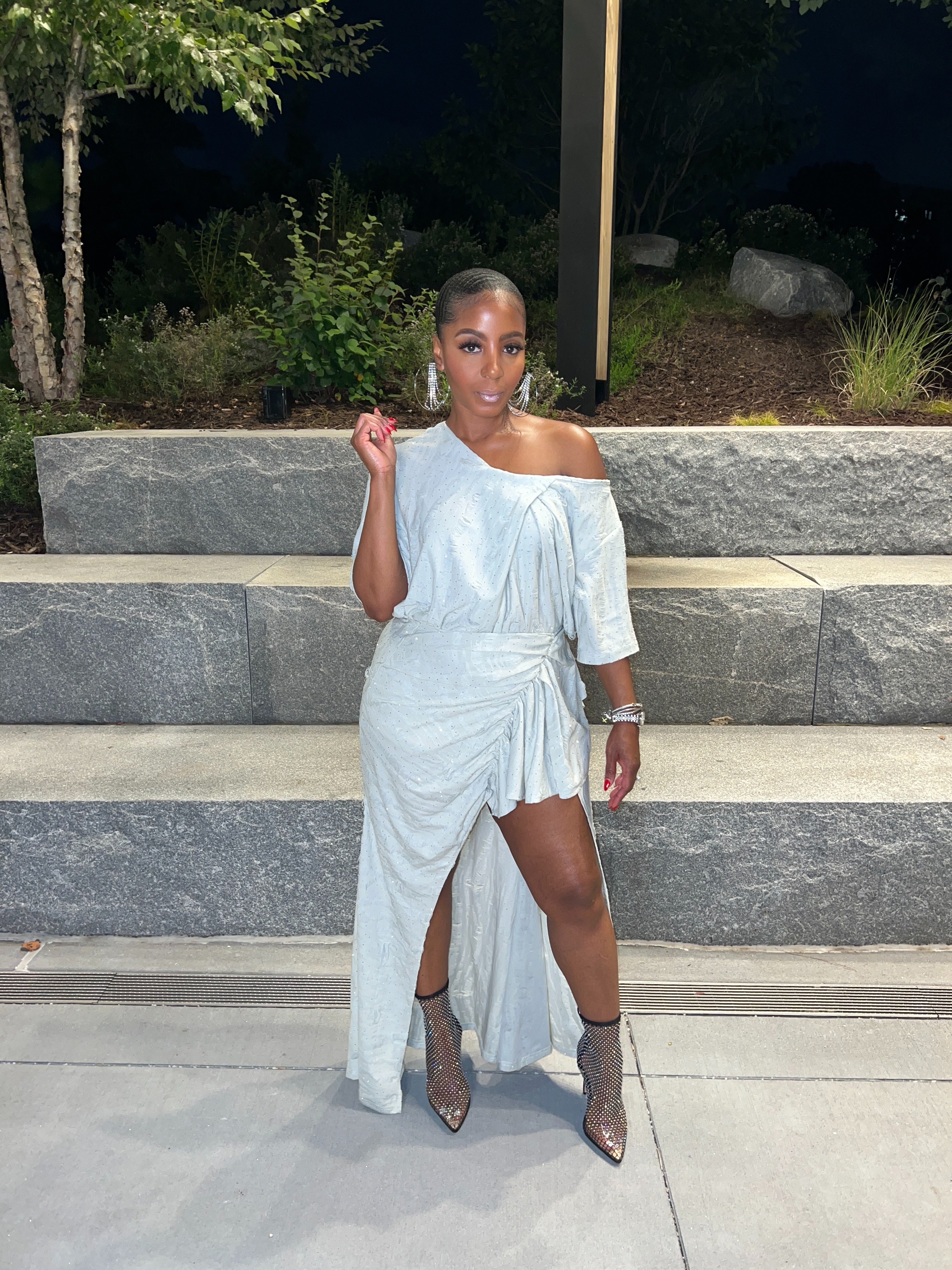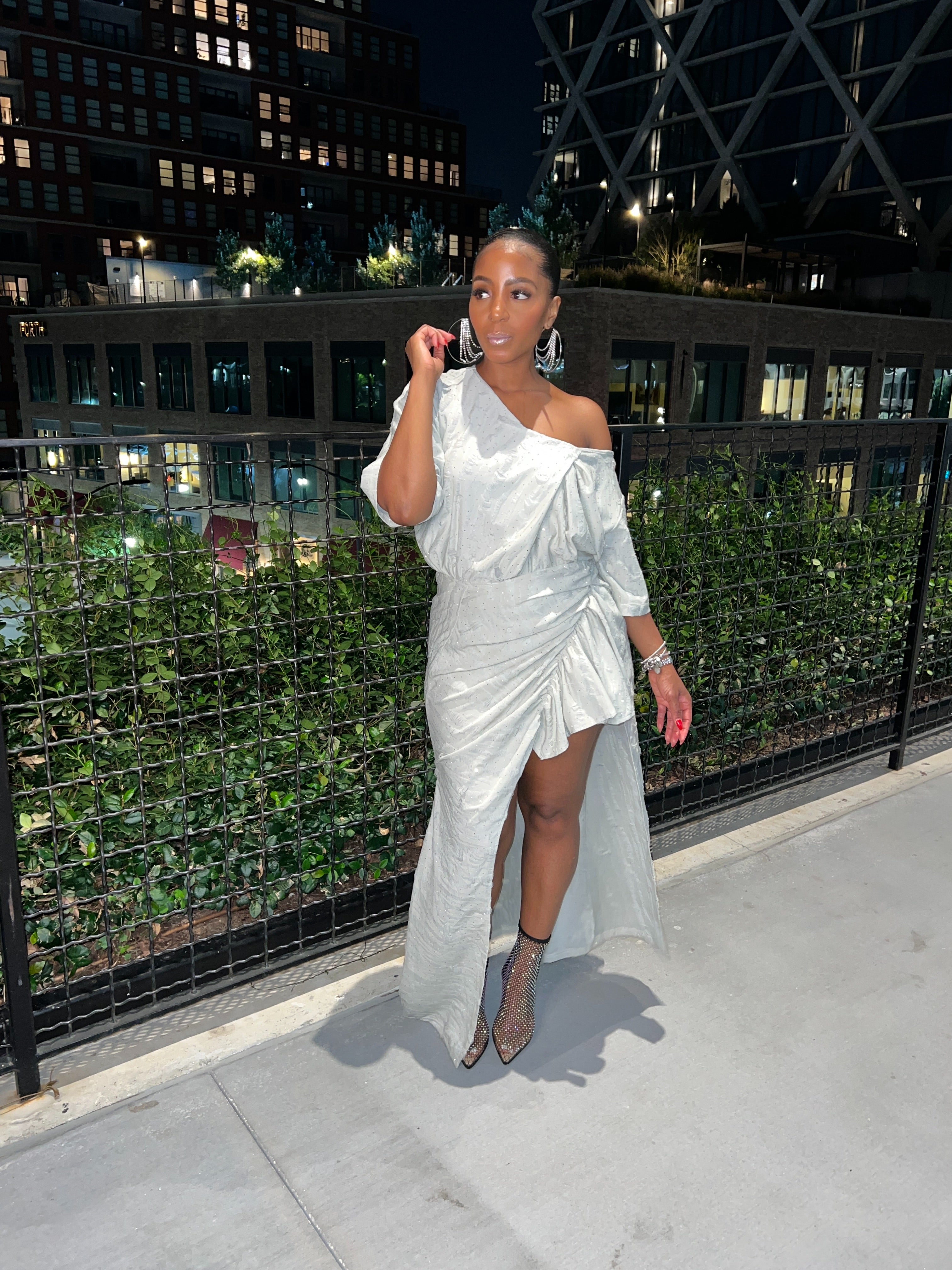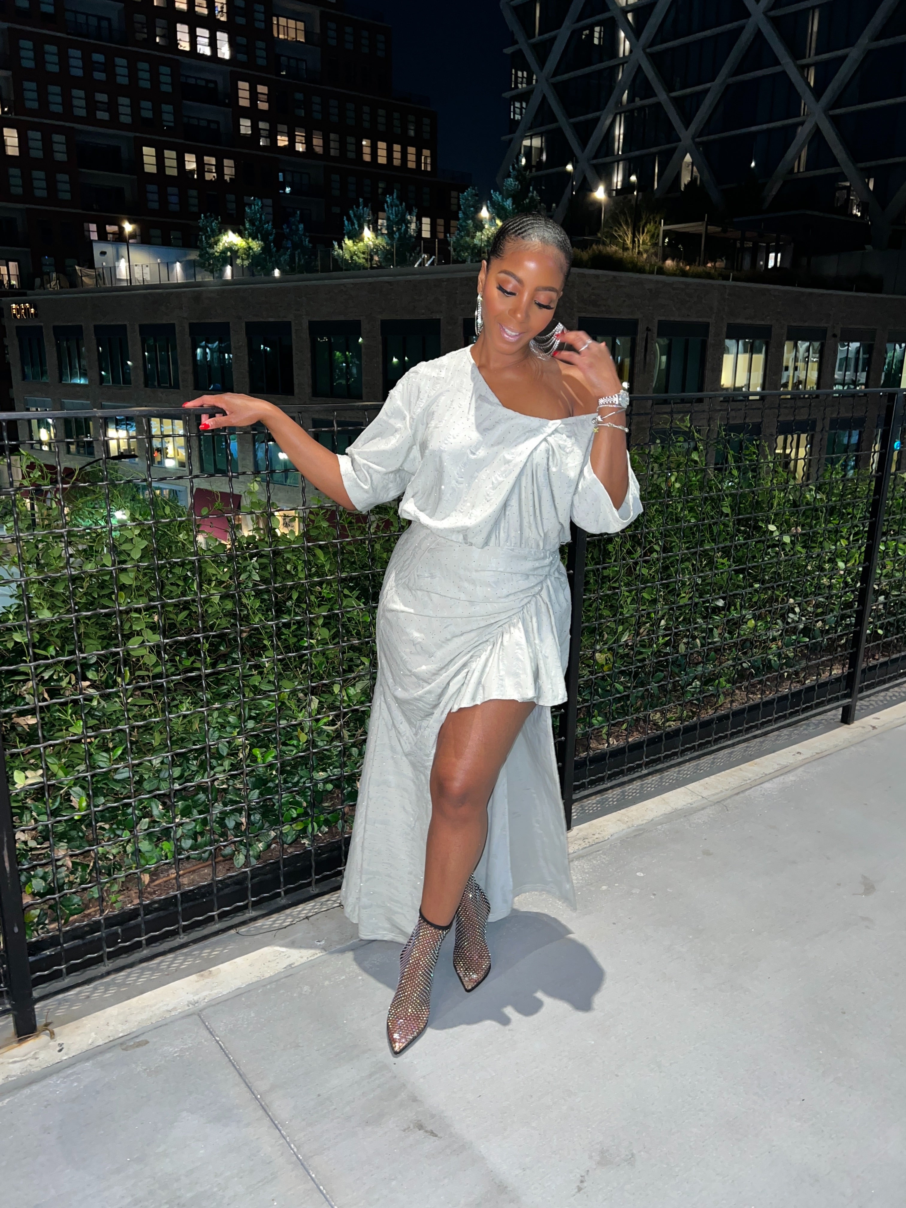 This two-piece set is the definition of effortless glamour with a modern twist. The top drapes off the shoulder with a relaxed elegance, giving just the right amount of edge. The asymmetrical skirt features adjustable ruching that lets you control the drama of the slit, while its uneven hemline keeps the silhouette fresh and dynamic.