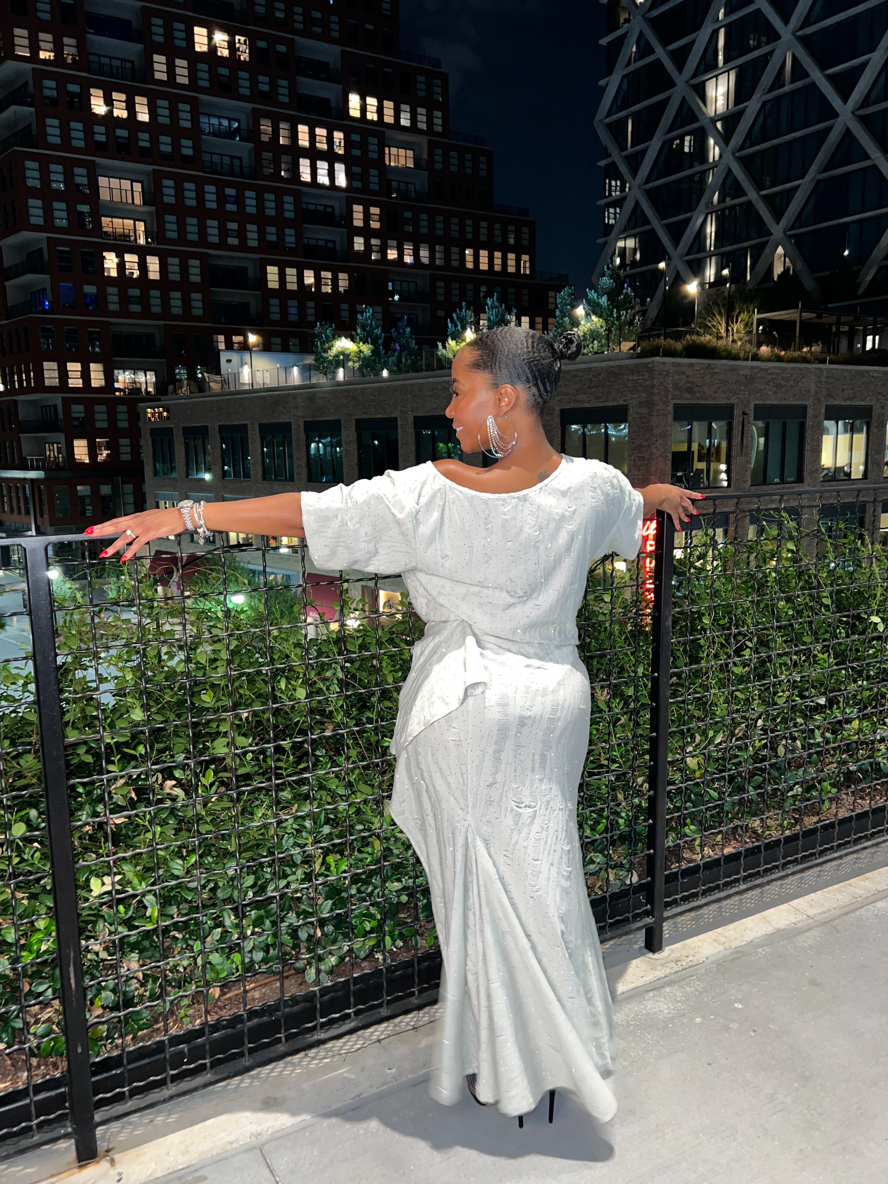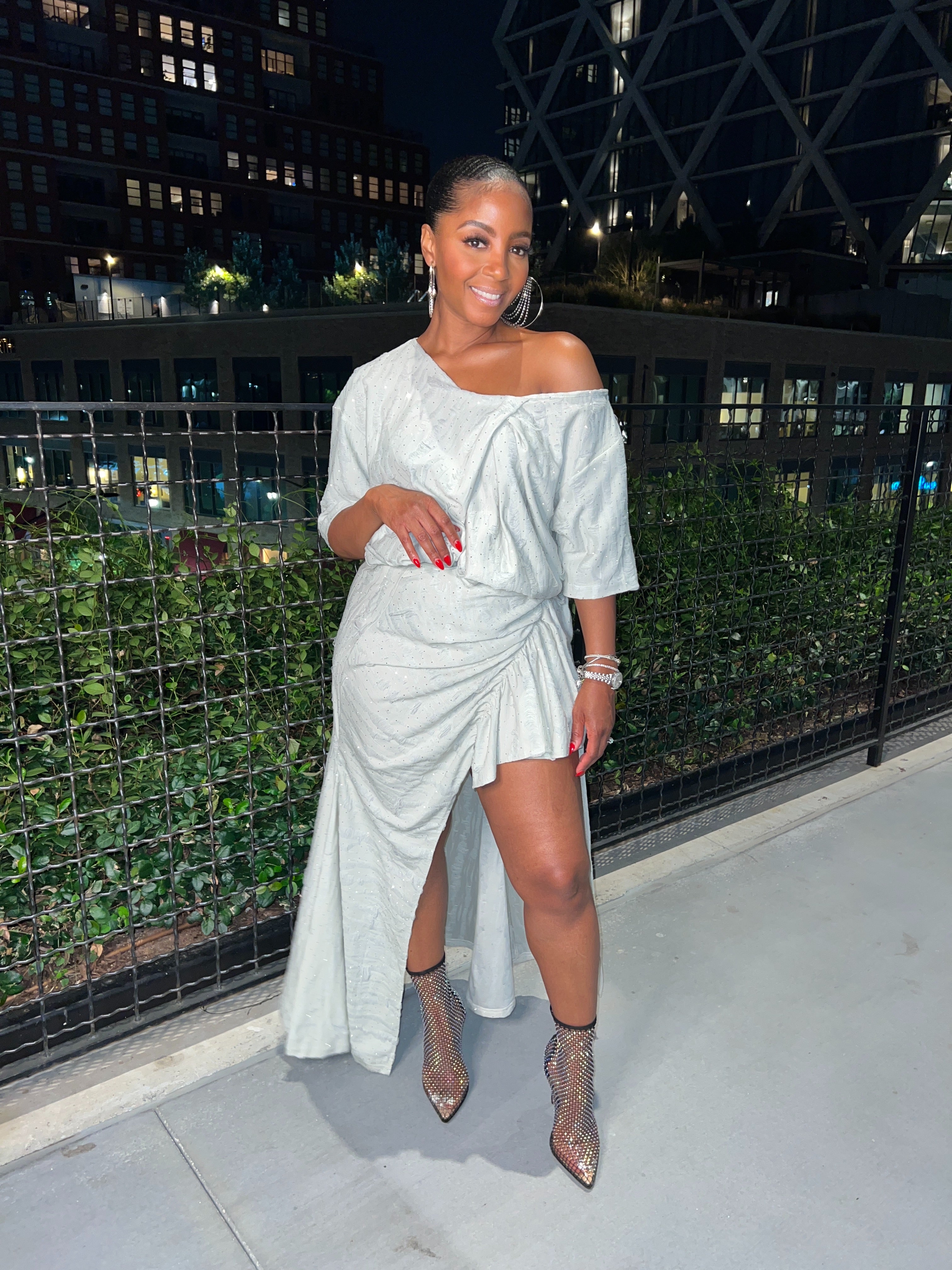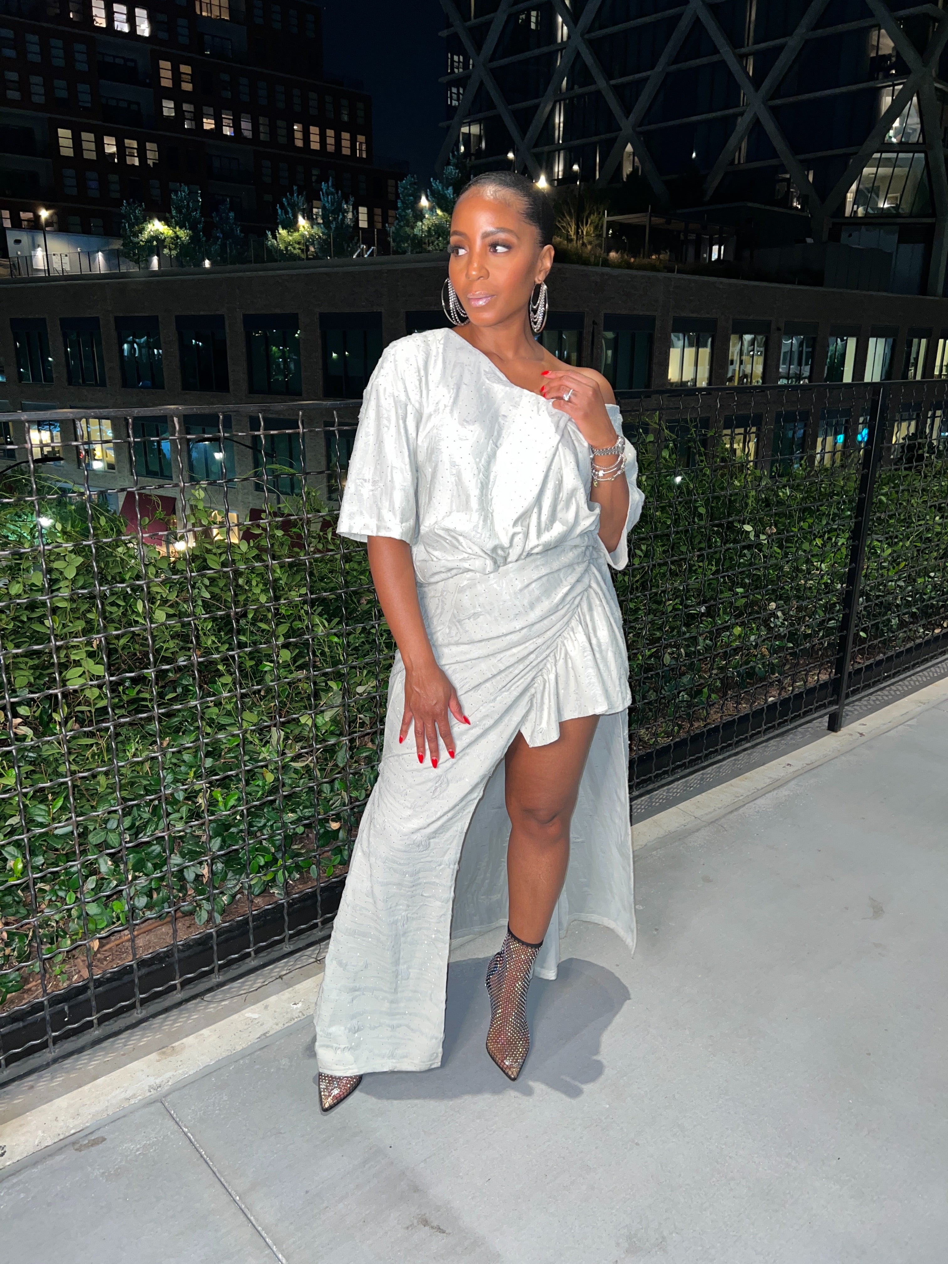 What really takes this look over the top is the silver beading scattered throughout — catching the light and making the entire outfit sparkle as you move. Perfectly styled with statement sneakers or heels, this set is ideal for fashion-forward moments where you want to shine without trying too hard.