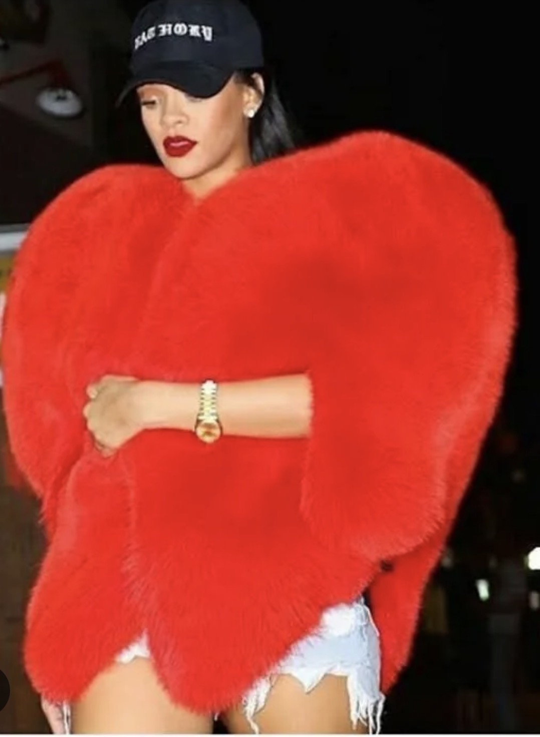 Wrap yourself in bold romance with this red heart-shaped fur jacket, a statement piece that exudes playful luxury. The plush faux fur is irresistibly soft, while the vibrant scarlet hue commands attention and radiates confidence. Designed with a unique heart-shaped silhouette, this jacket is both whimsical and fashion-forward, perfect for turning heads at any event. Its cropped fit and open-front style make it easy to layer over your favorite outfits, adding a touch of warmth and flair. Whether for a night out or a special occasion, this jacket ensures you wear your heart boldly and stylishly. One Size