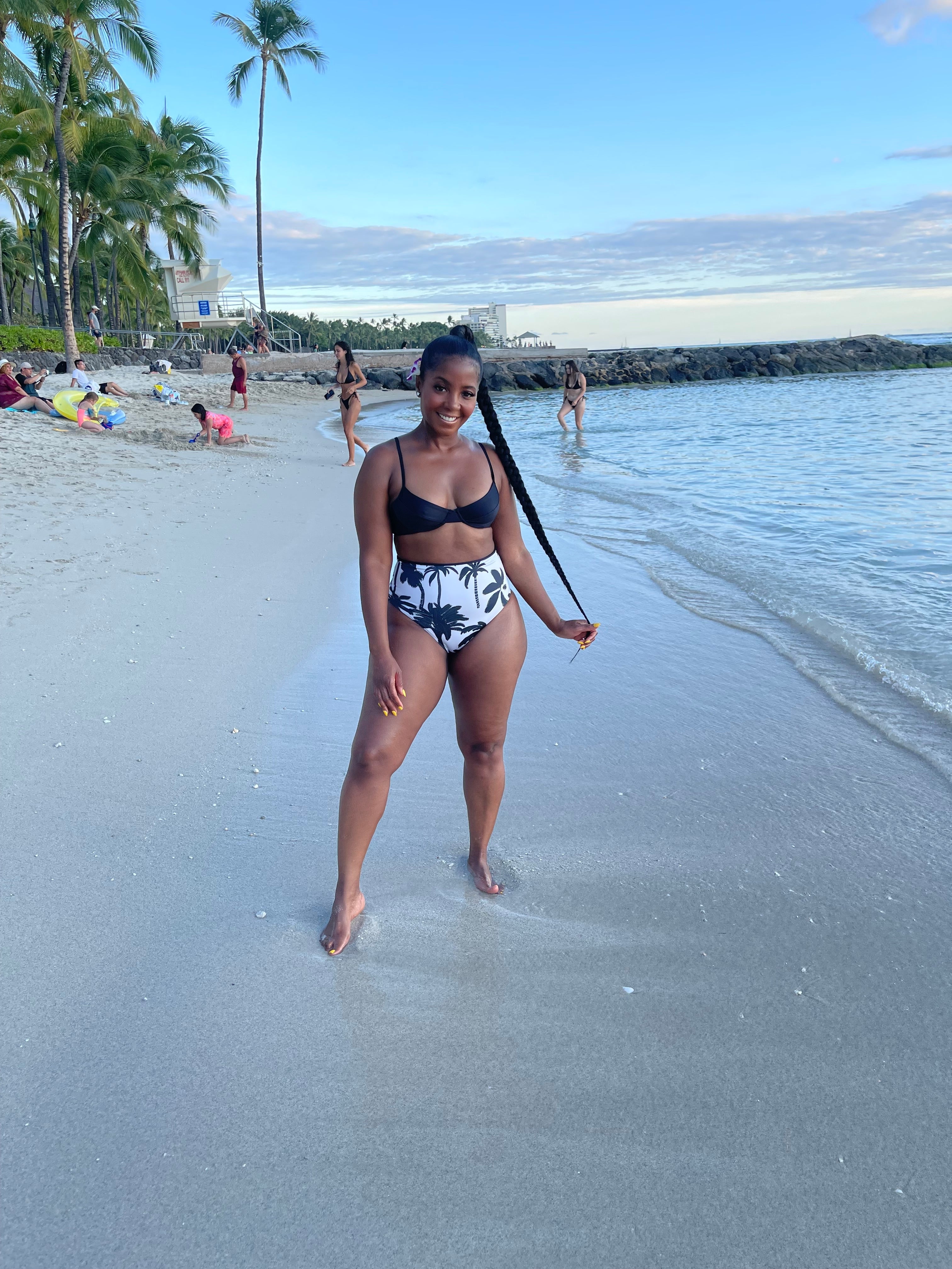 Designed with an off-white base and bold palm tree print, the high-waisted bottom hugs the waist just right while offering a cheeky, confidence-boosting fit. It’s sculpting, comfortable, and easy to move in—made to show off your shape without trying too hard.