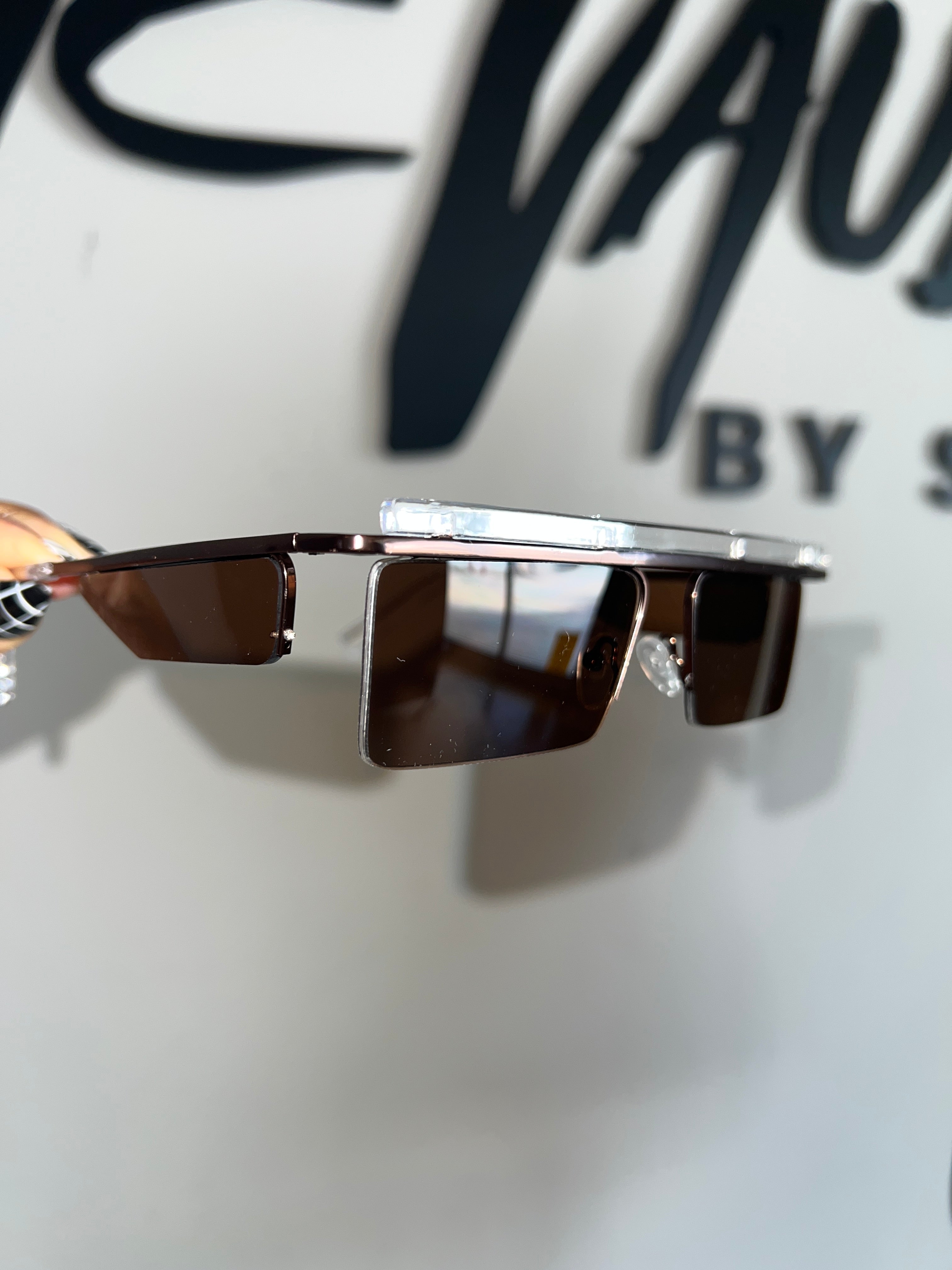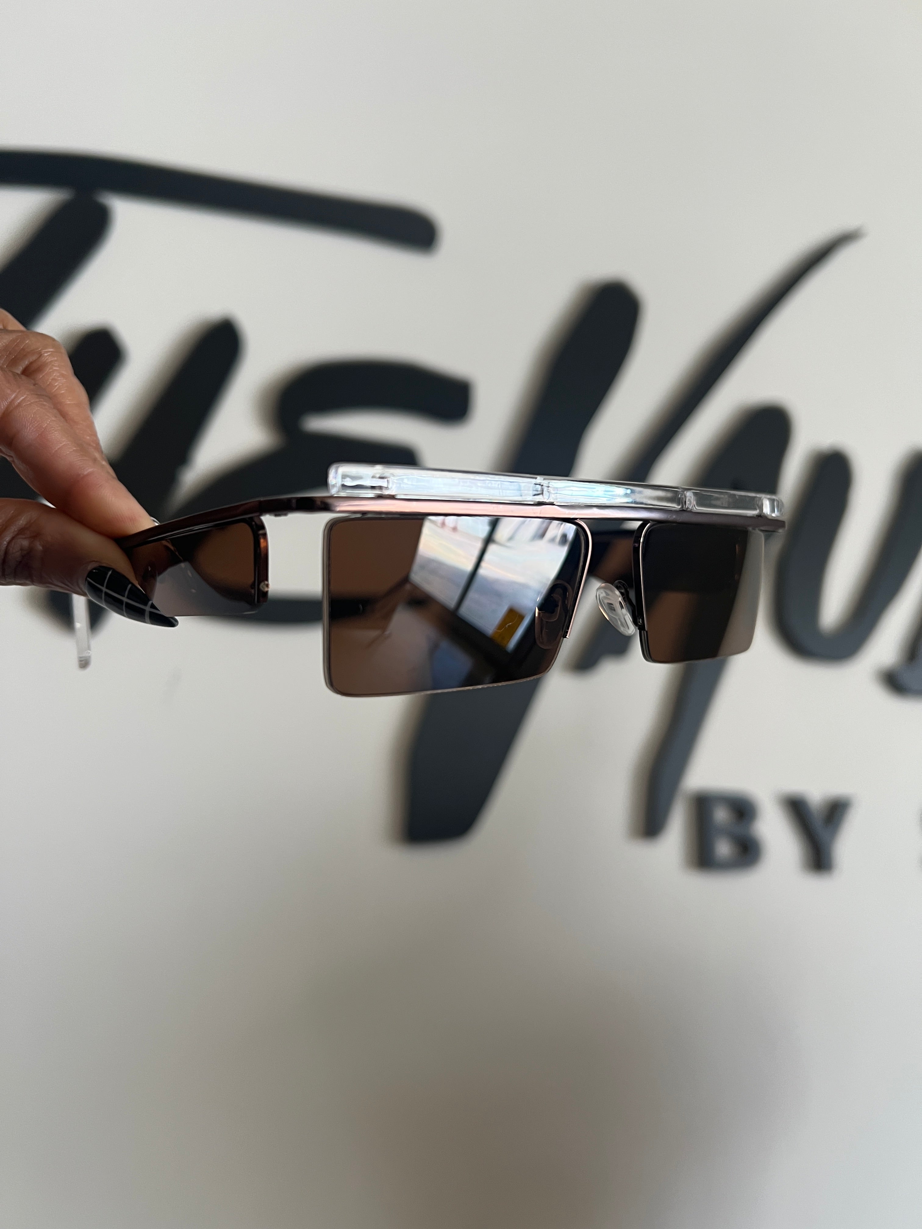 These sunglasses are pure statement energy — futuristic meets fearless. Featuring sharp rectangular frames and rich brown gradient lenses, they command attention with their clean edges and architectural design. The transparent arms add a modern contrast, keeping the look sleek yet edgy.