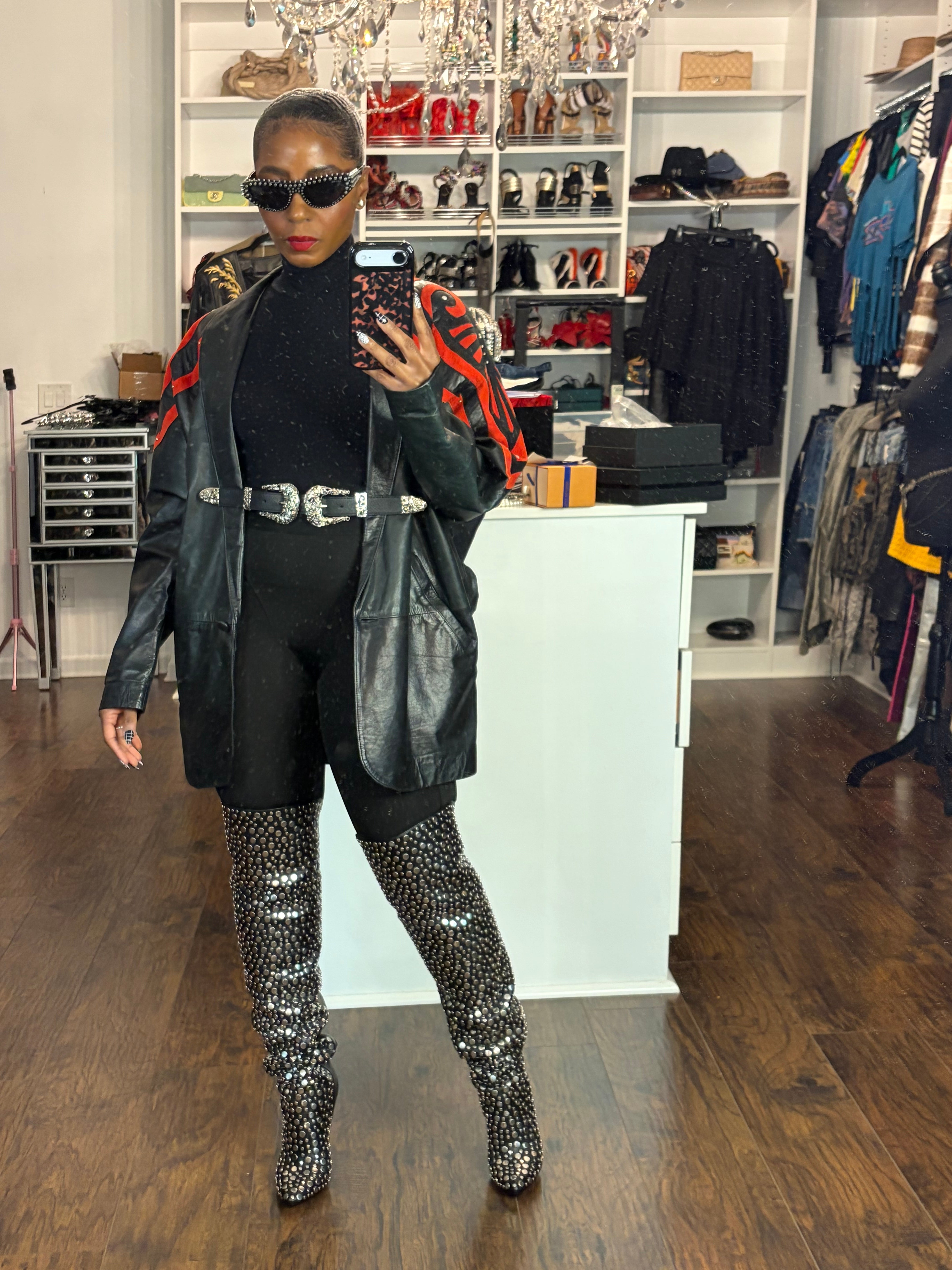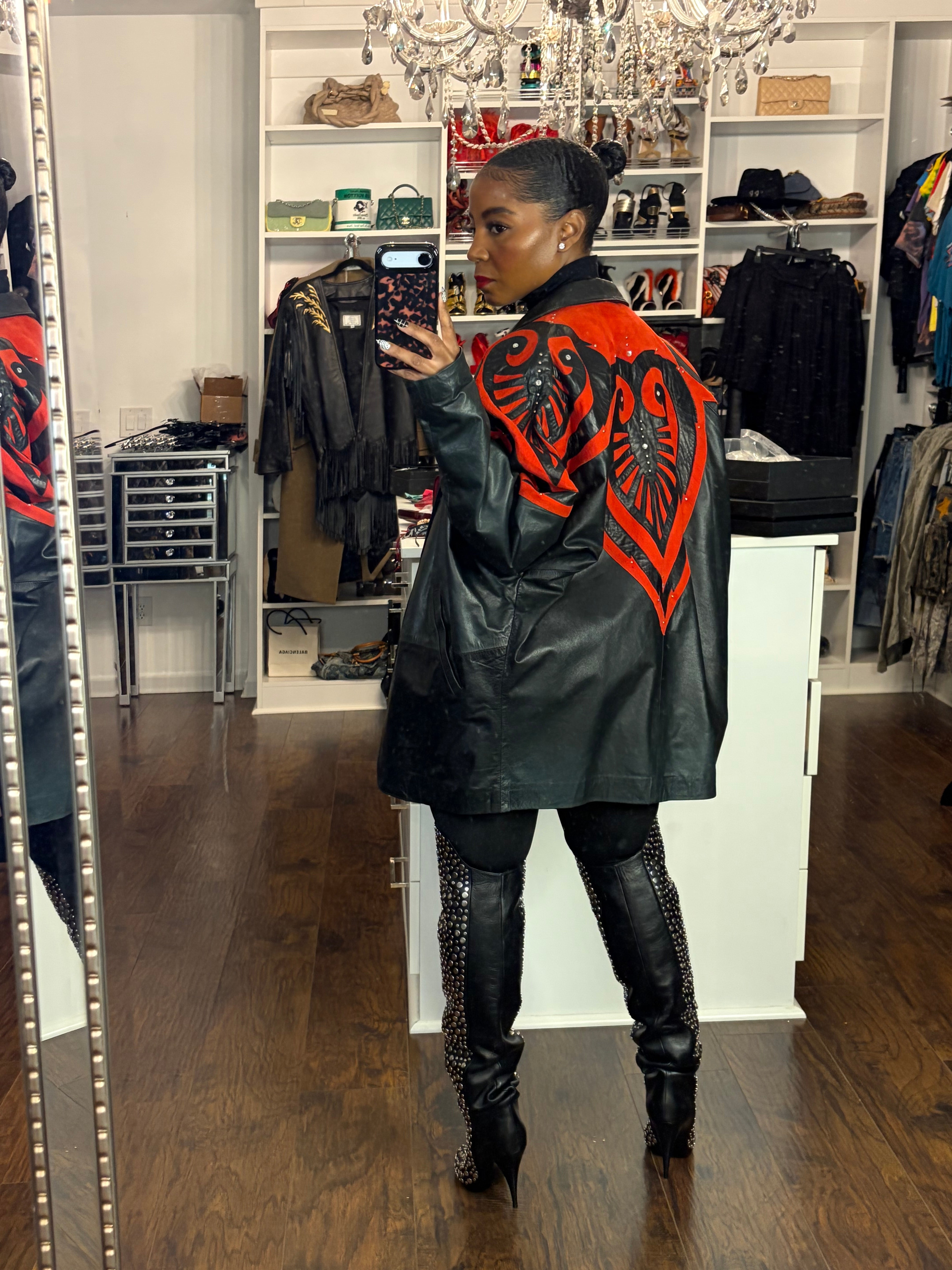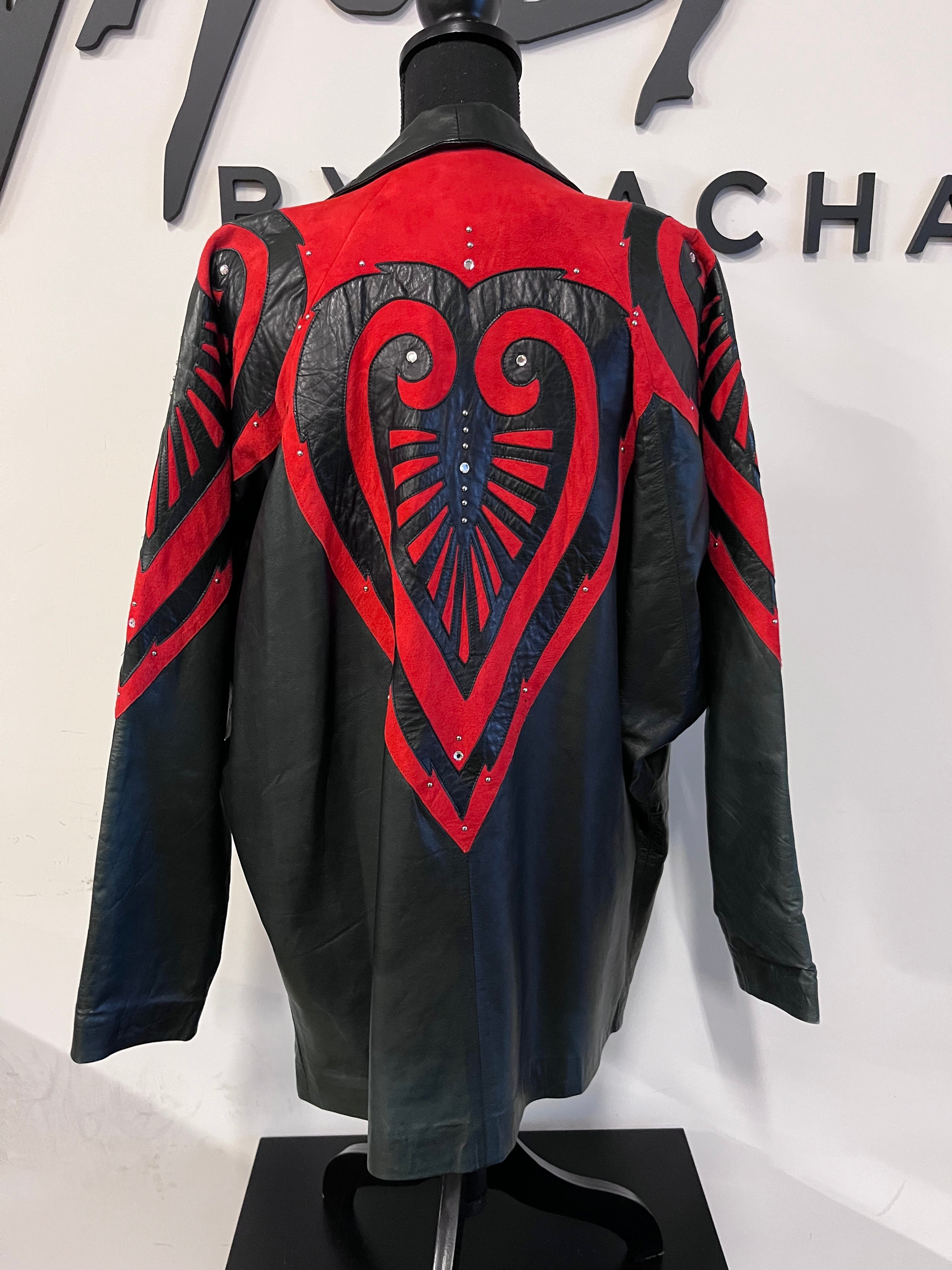 This vintage genuine leather and suede jacket blends luxury craftsmanship with edgy artistry, featuring a dramatic red heart-inspired design across the back—meticulously accented with crystals and studs that shimmer with every move.