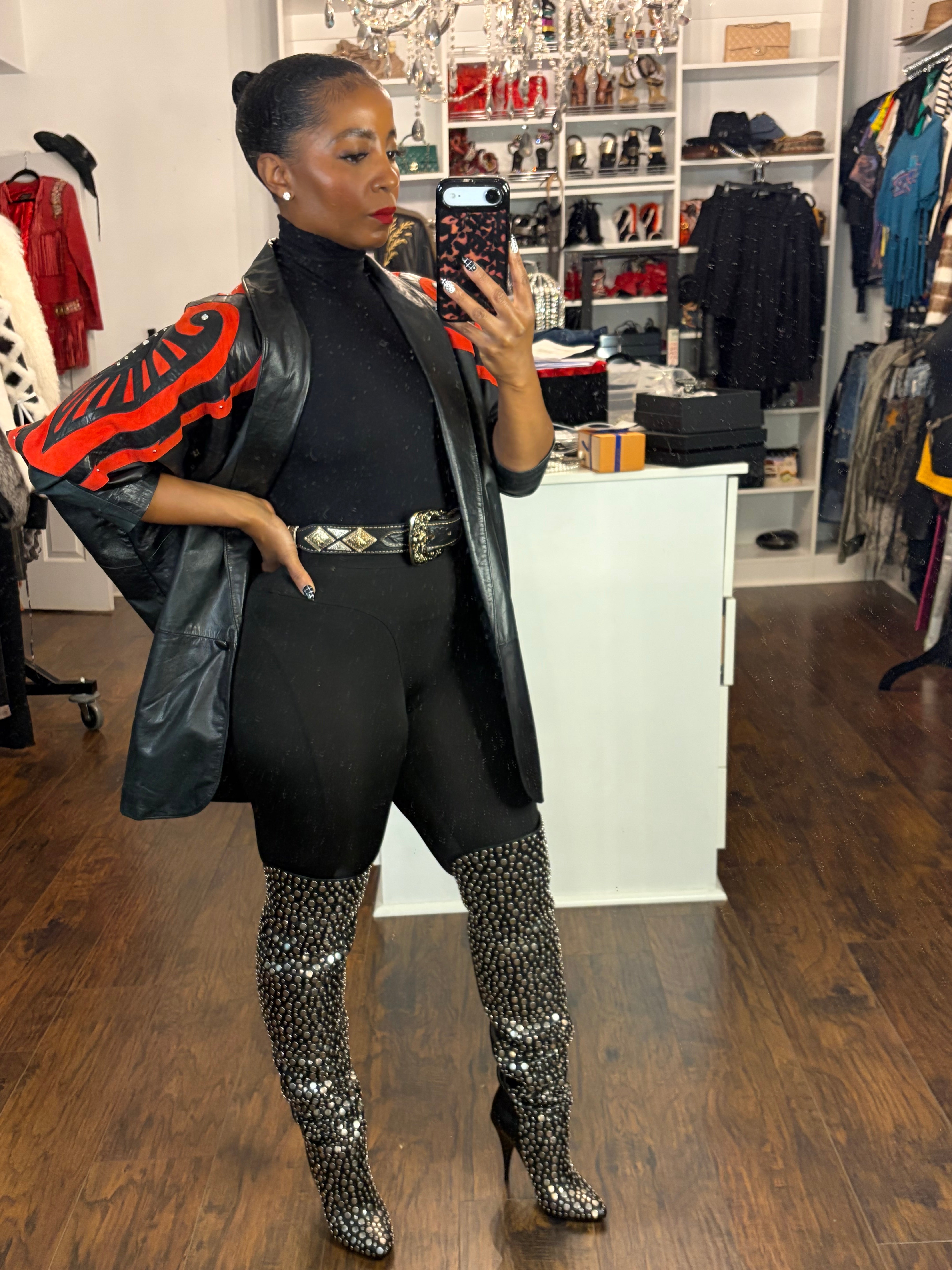 Soft yet structured, this piece captures the essence of 80s rock-glam meets modern runway edge. The supple black leather contrasts perfectly with the rich red suede insets, giving it depth, texture, and unmistakable attitude.