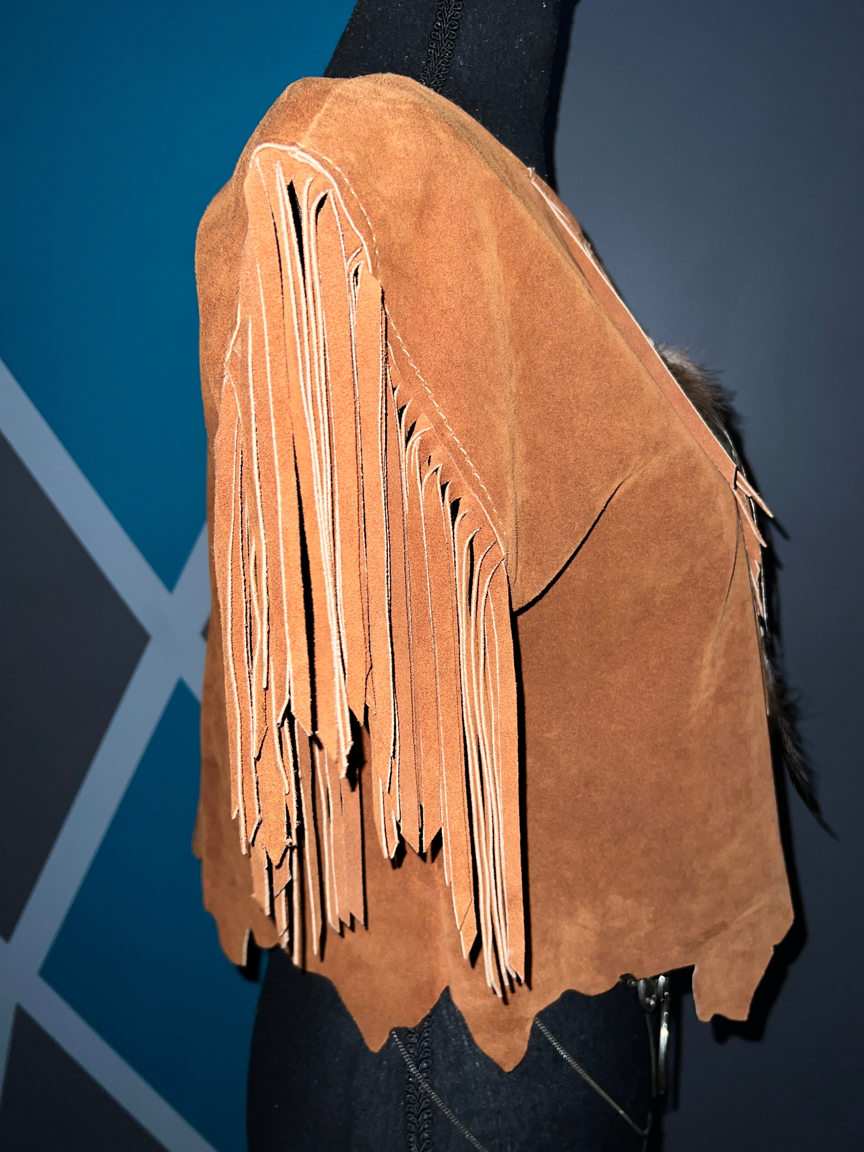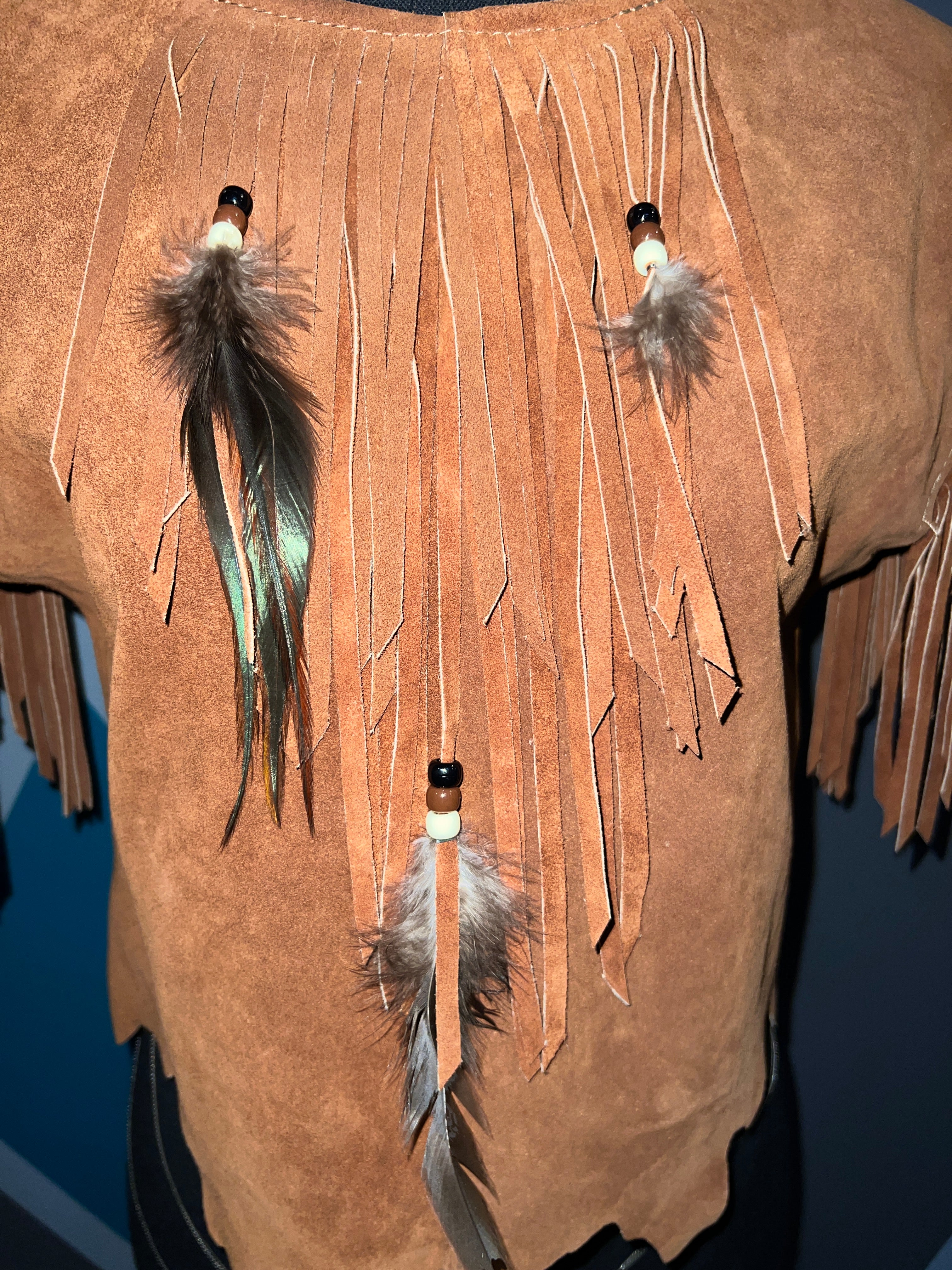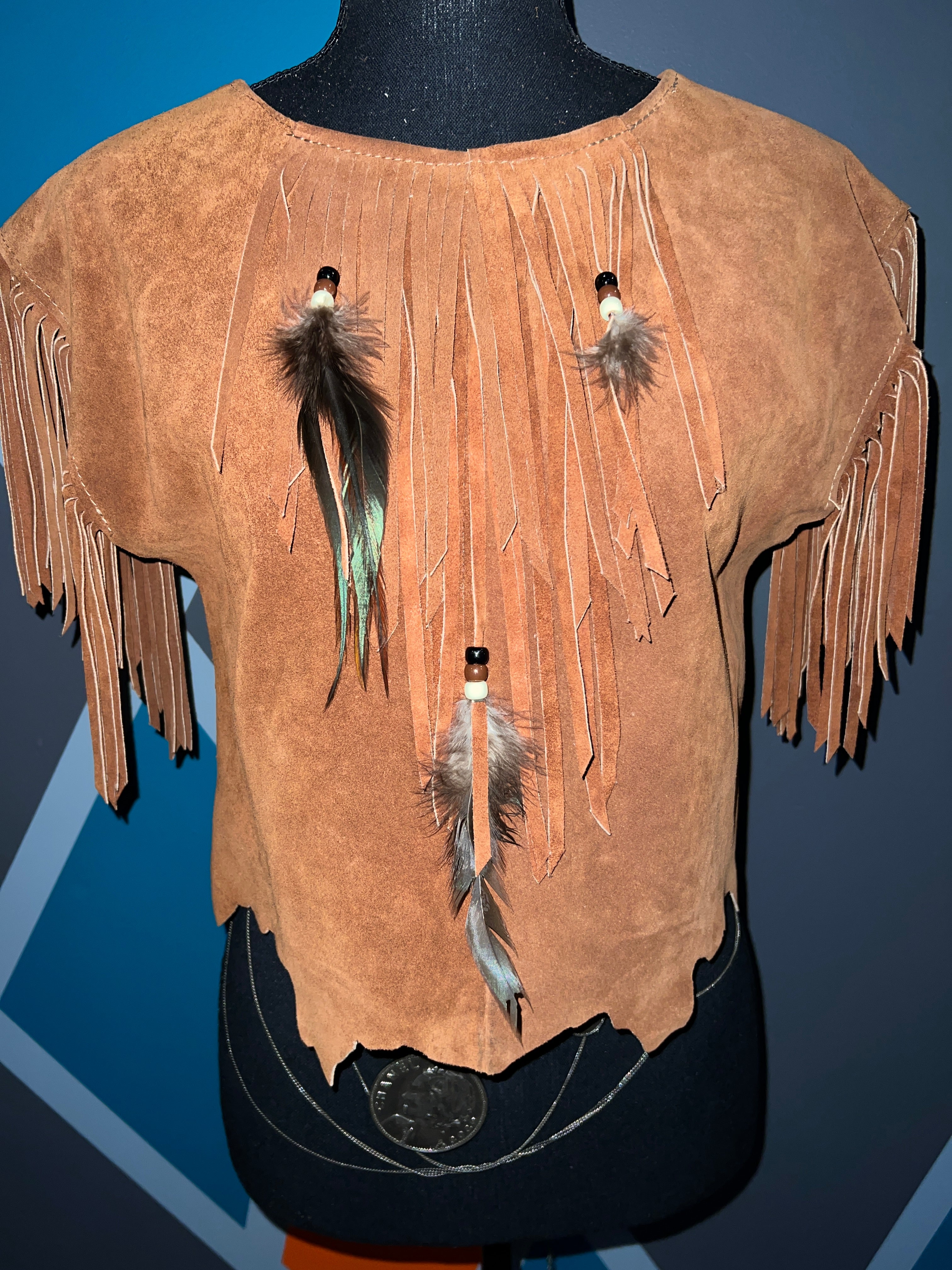 This camel colored suede vest boasts fringe detailing on the front and shoulders, as well as feathers and beading for a unique touch.