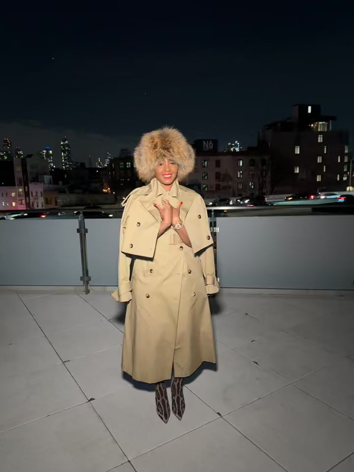 The plush fox fur trim adds a layer of warmth and sophistication, making it perfect for braving the cold with elegance.