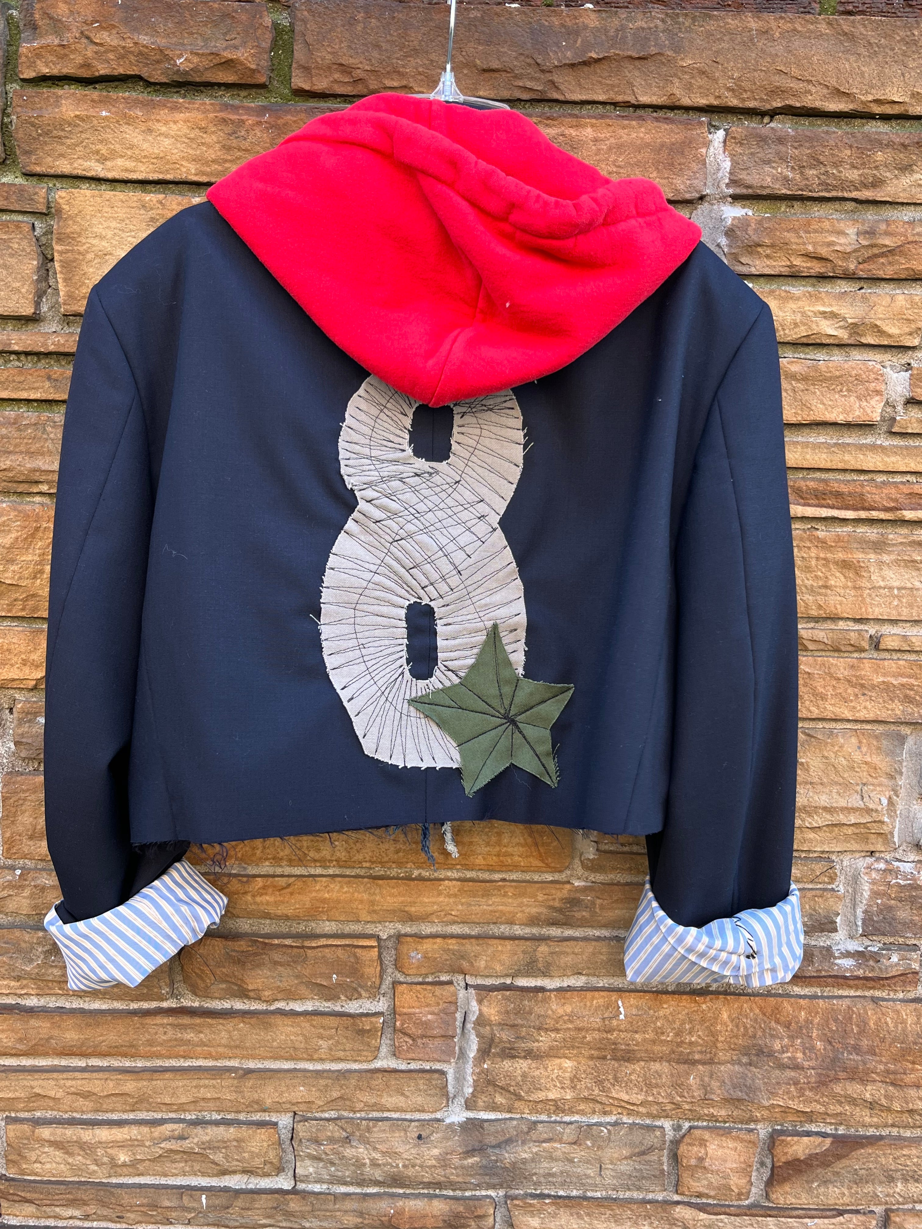 The Custom Red Hoodie Patchwork/Denim combines a distinctive style with functionality. Featuring adjustable drawstrings for a personalized fit, this one-of-a-kind blazer is enhanced by extraordinary stitching and patches, making it an ideal choice for those seeking a blend of comfort and individuality in their attire.