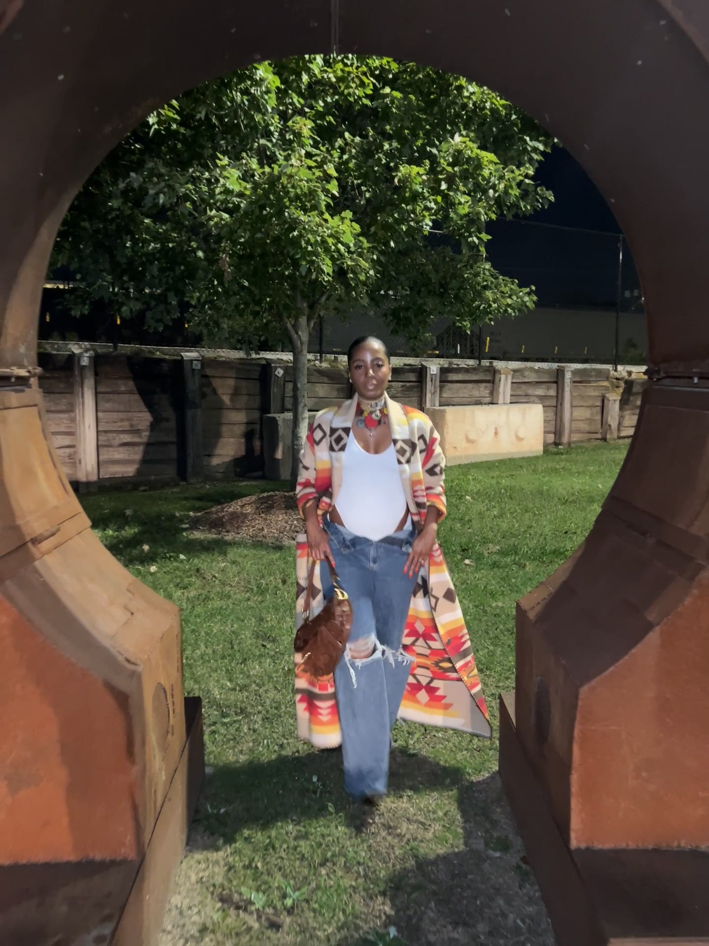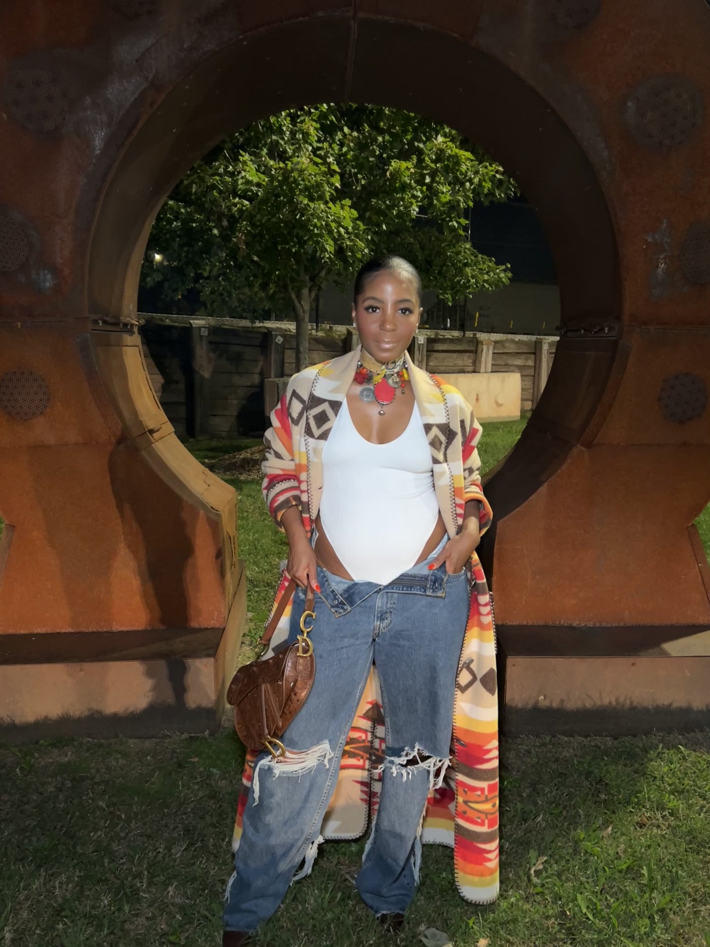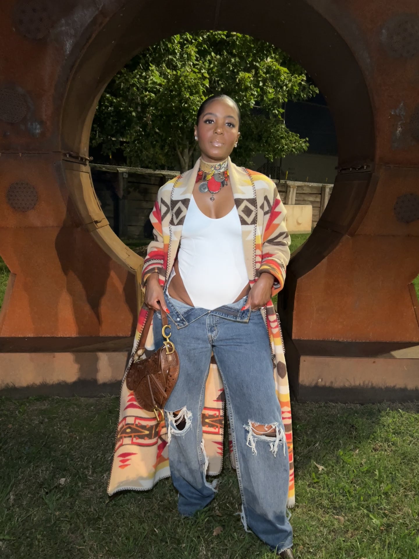 Styled with a statement belt and distressed jeans, this piece embodies an effortless, bohemian elegance with a modern twist.
