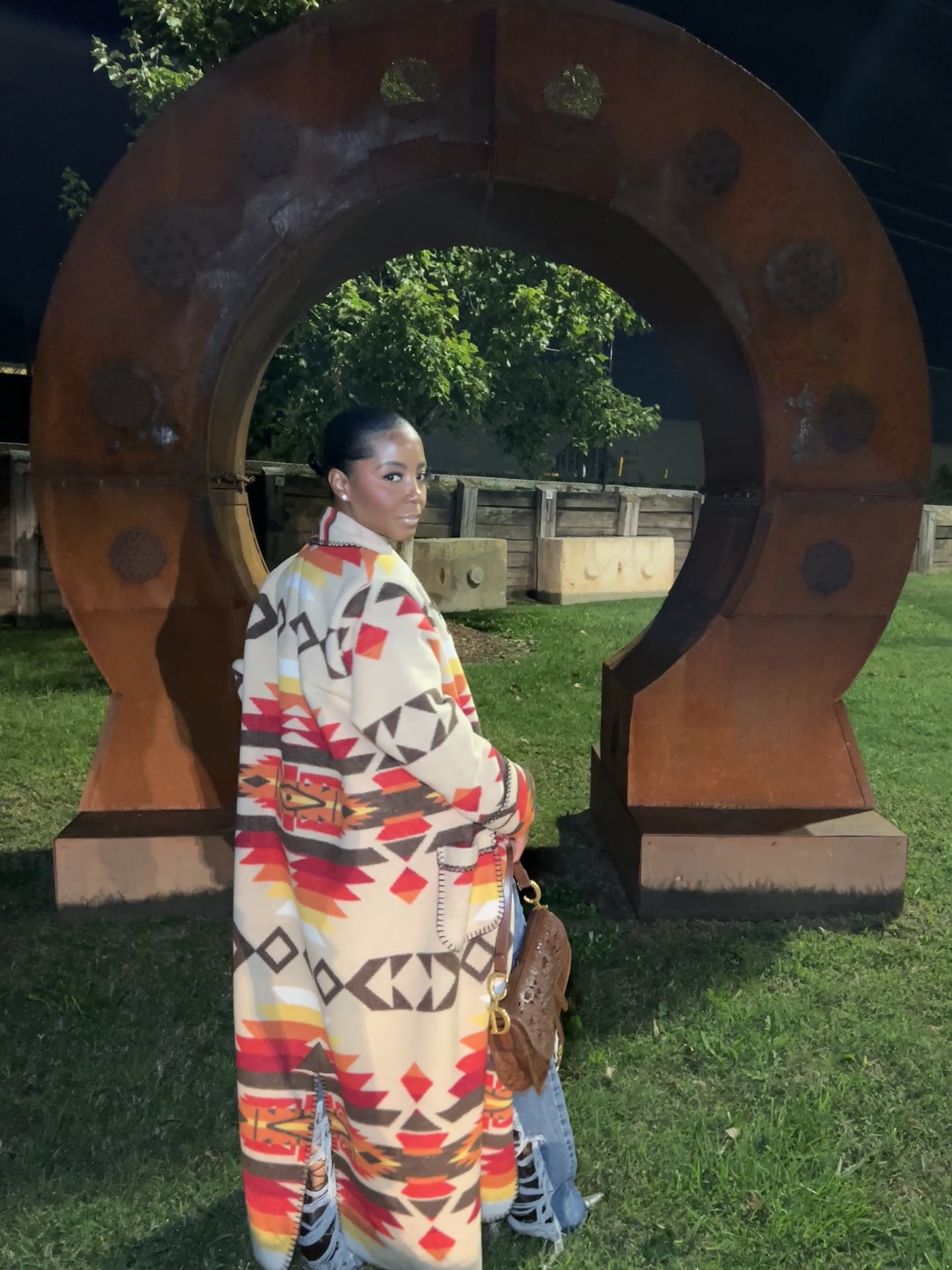 This striking duster is a celebration of earthy and rich tones. Its vibrant, sunset-hued patternāa mix of deep reds, oranges, yellows, and bold geometric shapesāgives off an energetic, almost nomadic vibe, reminiscent of desert landscapes.